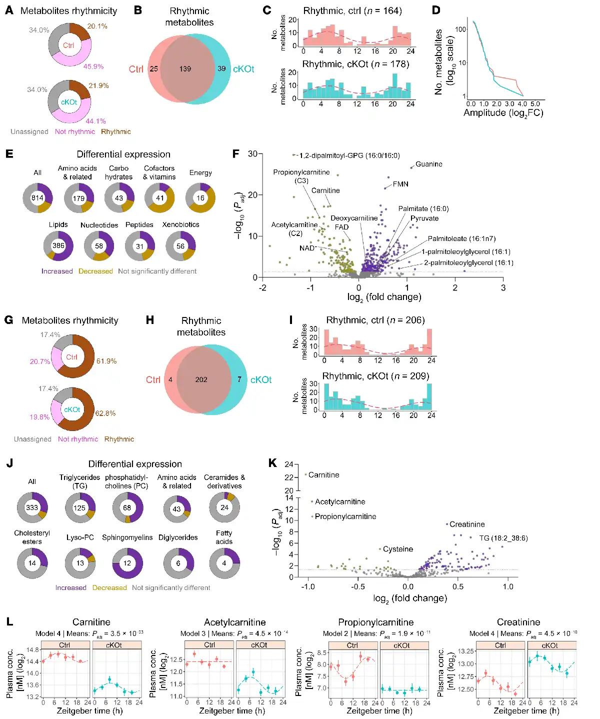 (A) Donut charts showing the percentage of rhythmic, nonrhythmic, and unassigned renal metabolites in control (Ctrl) and cKOt mice. (B) Venn diagram showing the number of rhythmic metabolites in kidneys of Ctrl and cKOt mice. (C) Histogram showing the acrophase distribution of rhythmic metabolites in kidneys of Ctrl and cKOt mice. Red dashed lines: kernel density estimates. (D) Cumulative number of rhythmic metabolites in Ctrl and cKOt mice in function of amplitude. (E) Donut charts showing the proportion of renal metabolites showing an increased, decreased, or not significantly altered mean level according to limma R package in cKOt versus Ctrl mice for each class of metabolites. (F) Volcano plot depicting metabolites significantly (Padj < 0.05) more abundant (purple dots) or less abundant (yellow dots) in kidneys of cKOt mice compared with Ctrl mice. (G) Donut charts showing the percentage of rhythmic, nonrhythmic, and unassigned plasma metabolites in Ctrl and cKOt mice. (H) Venn diagram showing the number of rhythmic metabolites in plasma of Ctrl and cKOt mice. (I) Histogram showing the acrophase distribution of rhythmic metabolites in plasma samples of Ctrl and cKOt mice. Red dashed lines: kernel density estimates. (J) Volcano plot depicting metabolites significantly (Padj < 0.05) more abundant (purple dots) or less abundant (yellow dots) in the plasma of cKOt mice compared with Ctrl mice. (K) Donut charts showing the proportion of plasma metabolites showing an increased, decreased, or not significantly altered mean level according to limma R package in cKOt versus Ctrl mice for each class of metabolite. (L) Temporal plots showing the plasma concentration, dryR rhythmicity model, and limma R package result of mean expression comparison between Ctrl and cKOt mice for carnitine, acetylcarnitine, propionylcarnitine, and creatinine in plasma metabolomes of Ctrl and cKOt mice.