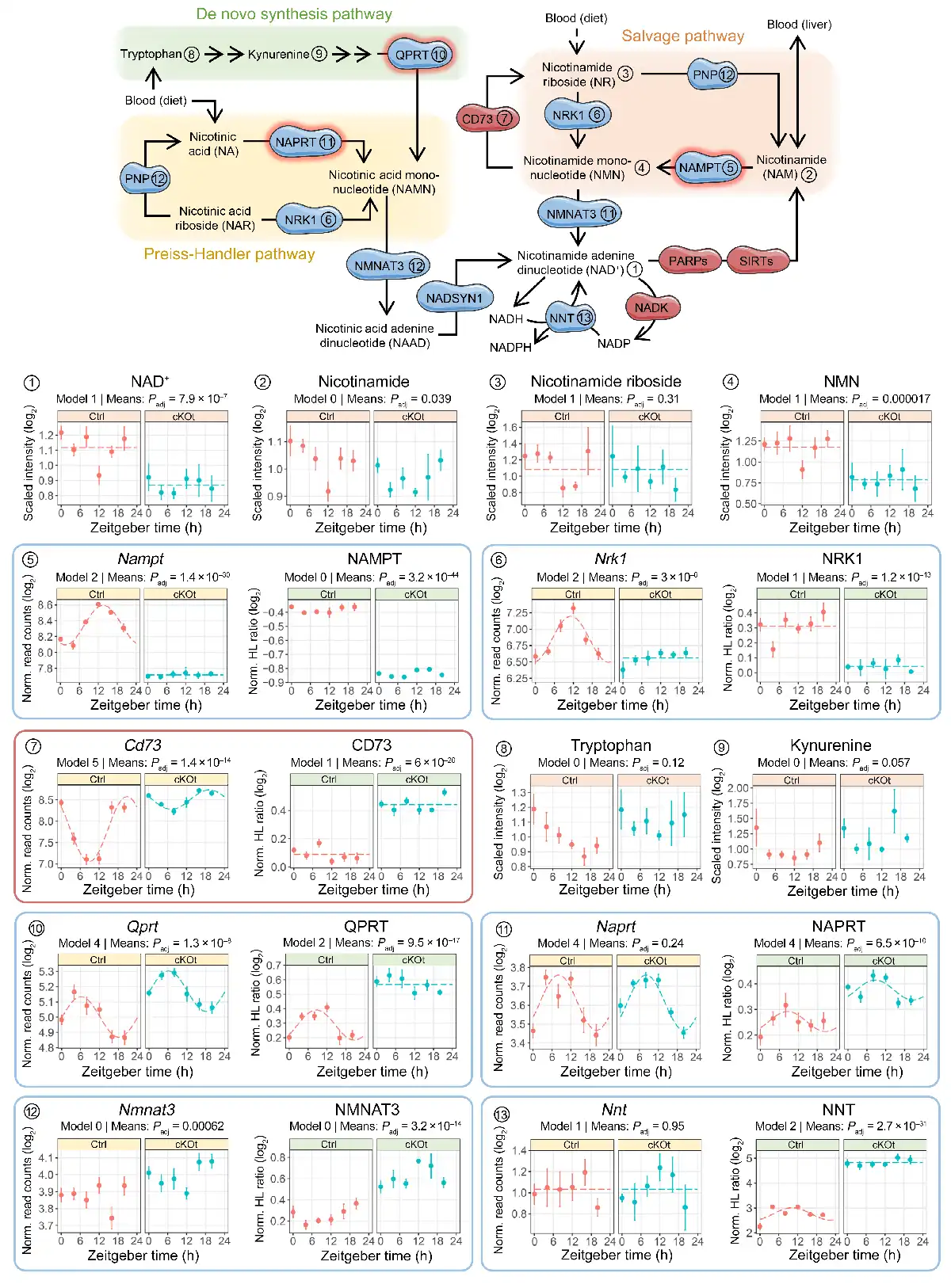 Schematic of the NAD+ metabolism depicting enzymes and metabolites involved in NAD+ synthesis from NAM, NAM riboside, nicotinic acid, and tryptophan (upper part). Enzymes in blue are involved in NAD+ synthesis, while enzymes in red are NAD+-consuming. Enzymes surrounded with red are rate limiting. Numbers link components of the pathway to temporal plots depicted in the lower part of the Figure. Temporal plots of major renal metabolites (peach), transcripts (yellow), and proteins (green) involved in NAD+ metabolism detected in renal transcriptomic, proteomic or metabolomic data sets in control (Ctrl) and cKOt mice. On each plot are mentioned the rhythmicity model and Padj obtained, respectively, from the dryR comparison of rhythmicity patterns and the limma R package mean expressions comparison in Ctrl and cKOt mice. CD73, cluster of differentiation 73 also known as ecto-5′-nucleotidase; NADK, NAD+ kinase; NADSYN1, glutamine-dependent NAD+ Synthetase; NAMPT, nicotinamide phosphoribosyltransferase; NAPRT, nicotinate phosphoribosyltransferase; NMNAT3, nicotinamide nucleotide adenylyltransferase isoform 3; NNT, NADP transhydrogenase; NRK1, nicotinamide riboside kinase 1; PARPs, poly(ADP-ribose) polymerases; PNP, purine nucleoside phosphorylase; QPRT, quinolinate phosphoribosyltransferase; SIRTs, sirtuins.