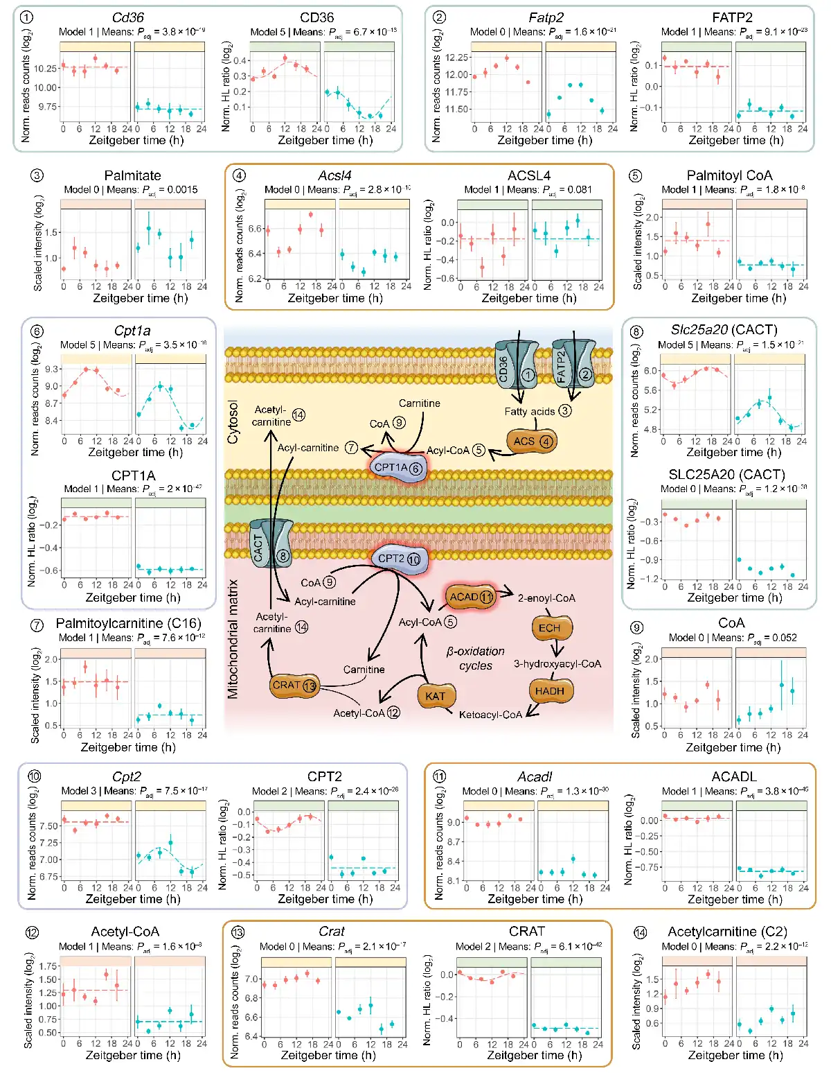 Schematic (center) and temporal plots (edges) of FA metabolism depicting major renal metabolites (peach), transcripts (yellow), and proteins (green) involved in FA entry and activation, acyl-carnitine shuttle into mitochondria, and acyl-CoA β-oxidation. Proteins surrounded with red are rate limiting. Numbers link components of the schematic to temporal plots. Rhythmicity model and Padj obtained, respectively, from the DryR comparison of rhythmicity pattern and limma R package mean expressions comparison in Ctrl and cKOt mice are mentioned in each plot. ACADL, acyl-coenzyme A dehydrogenase, long chain; ACSL4, acyl-CoA synthetase long chain family member 4; CACT, mitochondrial carnitine/acylcarnitine carrier protein; CD36, cluster of differentiation 36 also known as fatty acid translocase (FAT); CPT1A, Carnitine palmitoyltransferase 1A; CPT2, carnitine palmitoyltransferase 2; CRAT, carnitine O-acetyltransferase; FATP2, fatty acid transport protein 2.