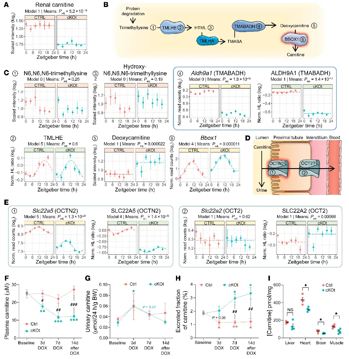 (A) Temporal plot showing the renal carnitine content in Ctrl and cKOt mice. (B) Schematic of renal carnitine synthesis pathway where BBOX1 (surrounded with red) is the rate limiting enzyme. (C) Temporal plots of major renal metabolites (peach), transcripts (yellow) and proteins (green) involved in carnitine synthesis detected in kidneys of Ctrl and cKOt mice. (D) Schematic of renal carnitine handling in proximal tubules: OCTN2 (SLC22A5) transporter (surrounded in red) is rate limiting for apical reabsorption of filtered carnitine. (E) Temporal plots showing the relative expression of renal carnitine transporters in kidneys of Ctrl and cKOt mice. Numbers link components of B to temporal plots. (F–H) Carnitine concentrations in plasma (F) or urine (G) and carnitine-excreted fraction (H) in Ctrl and cKOt mice before DOX treatment (baseline), 3 or 7 days after the beginning of the DOX treatment (3d or 7d DOX), and 2 weeks after the end of DOX treatment (14d post-DOX). (I) Carnitine content in liver, brain, skeletal muscle (right rectus femoris), and heart of Ctrl and cKOt mice 4 weeks after the end of DOX treatment. Throughout the Figure, the rhythmicity model obtained from dryR and Padj value obtained from limma mean expressions comparison in Ctrl and cKOt mice are mentioned on temporal plots. Results in panels F to I are mean ± SEM (n= 4 in each genotype) determined by 2-way ANOVA and Sidak’s multiple comparison posthoc tests. OCT2, organic cation transporter 2 (OCT2); BBOX1, γ-butyrobetaine hydroxylase 1; HTML, hydroxytrimethyllysine; OCTN2, organic cation transporter novel family member 2 (SLC22A5); TMABA, trimethylaminobutyraldehyde; TMABADH, trimethylaminobutyraldehyde dehydrogenase; TMLHA, hydroxyl-trimethyl-lysine aldolase; TMLHE, trimethyl-lysine hydrolase ε.