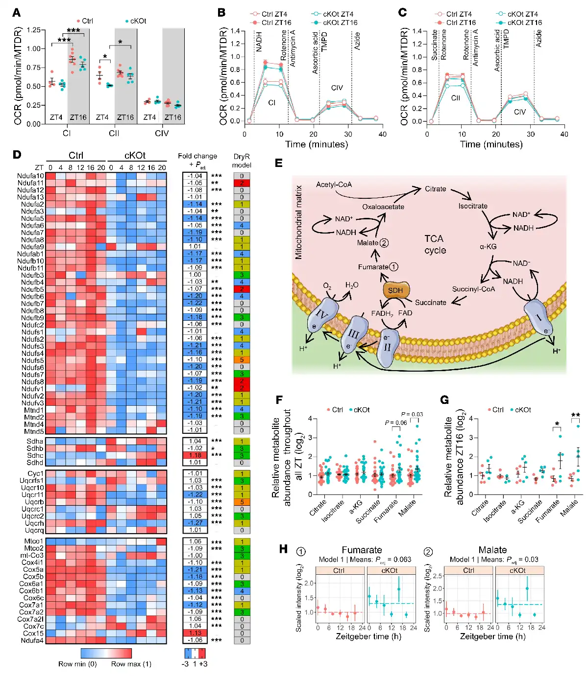 (A–C) Oxygen consumption rates (OCR) of mitochondrial respiratory chain complexes I (CI), II (CII) or IV (CIV) in the kidneys of Ctrl and cKOt mice at ZT4 and ZT16. In A, data are presented as individual values, with mean ± SEM determined by 2-way ANOVA and Sidak’s multiple comparison posthoc tests. In B and C, data are resented as mean ± SEM and vertical dashed lines depict time-points of metabolic substrates injection during OCR measurement. (D) Heatmaps showing the relative expression and the fold change in mean expression of proteins forming CI to CIV complexes in the kidneys of Ctrl and cKOt mice. Statistics determined by limma comparison at 6 circadian time-points. Fold changes ≥ 1.10 are depicted in blue or red. Rhythmicity models are shown to the right of the heatmap. (E) Schematic of the Tricarboxylic acid (TCA) cycle and electron transport chain in mitochondrial matrix. Numbers are related to plots in H. (F and G) Plots showing the relative abundance of major TCA cycle metabolites at 6 circadian time points (F) or at ZT16 (G) in kidneys of Ctrl and cKOt mice. Data are individual values with mean ± SEM. In F, means were compared using limma and Padj < 0.1 are shown. In G, means were compared using 2-tailed multiple t tests and resulting P values were corrected using the FDR approach (2-stage Step-up method of Benjamini, Krieger and Yekutieli). (H) Temporal plots of fumarate and malate abundance with corresponding rhythmicity model and Padj from dryR and limma comparisons in kidneys of Ctrl and cKOt mice. SDH, Succinate dehydrogenase. *P < 0.05; **P < 0.001; ***P < 0.0001.