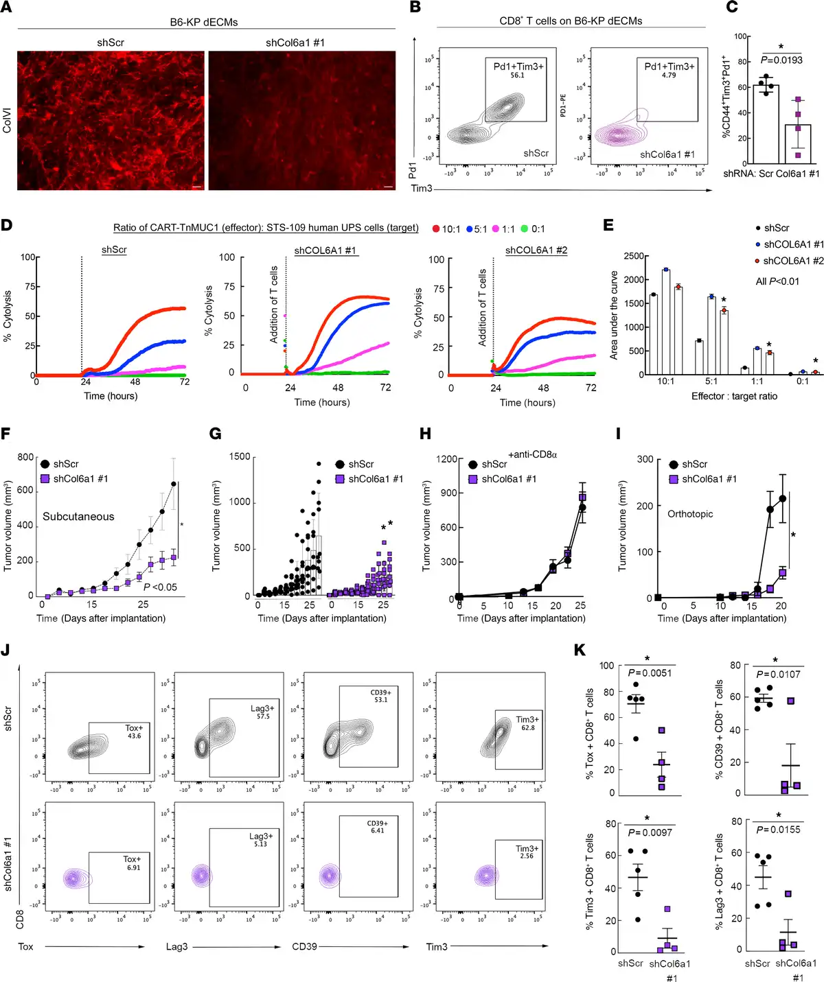 (A) Representative wide-field images of ColVI immunofluorescence in dECMs generated from control and shCol6a1-expressing B6-KP cells. Scale bars: 20 μm. Brightness and contrast were adjusted for publication. (B and C) Representative contour plots (B) and quantification (C) of Pd1 and Tim-3 coexpression in CD44+CD8+ T cells incubated on dECM derived from control or shCol6a1 KP cells. (D) Average longitudinal cytolysis of shScr- or shCOL6A1-expressing human STS-109 UPS cells cocultured with CART-TnMUC1 cells from 3 independent human donors (n = 2 for shCOL6A1 #1). Points for individual replicates overlap. Measurements indicate percent target cell (UPS cell) cytolysis. (E) Quantification of area under the curve from D; 1-way ANOVA with Dunnett’s test (vs. shScr) for each ratio. In D and E, shScr data are identical to those in Figure 1J (performed in the same experiment). (F) Tumor growth curves from subcutaneous (flank) syngeneic transplant of 3 × 104 B6-KP cells in Matrigel expressing control or Col6a1-targeting shRNAs in syngeneic C57BL/6 mice; 2-way ANOVA. (G) Individual tumors from F. (H) Tumor growth curves depicting subcutaneous (flank) syngeneic transplant of 5 × 105 KP cells (SKPY42.1 cell line) expressing control or Col6a1-targeting shRNAs in C57BL/6 mice treated with α-CD8α every 3 days. (I) Tumor growth curves depicting syngeneic orthotopic transplant (into the gastrocnemius muscle) of 2.5 × 105 KP cells (SKPY42.1 cell line) expressing control or Col6a1-targeting shRNAs in C57BL/6 mice; 2-way repeated-measures ANOVA, SEM. (J and K) Representative contour plots (J) and quantification (K) of T cell dysfunction markers in CD8+ T cells from control and shCol6a1 orthotopic tumors from I. Each point in K represents an individual tumor. Two-tailed unpaired t tests.