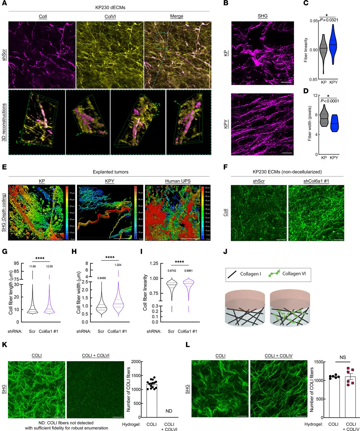 (A) Representative confocal micrographs (maximum-intensity Z-projections) and 3D reconstructions showing ColI and ColVI coimmunofluorescence in KP cell–derived dECMs. Scale bar: 100 μm. (B) Representative multiphoton second-harmonic generation (SHG) images (maximum-intensity Z-projections) of KP and KPY tumor sections. Scale bars: 50 μm. (C and D) Violin plots of CT-FIRE analysis of images from B. Mean fiber width and linearity were plotted for at least 5 separate fields (n = 5 mice per genotype); 2-tailed unpaired t test. (E) Representative depth-coded SHG images of human UPS, KP, and KPY explanted live tumors. Red, SHG signal farthest from the objective/greatest relative tissue depth; blue, SHG signal closest to the objective/shallowest relative tissue depth. Scale bars: 50 μm. (F) Representative confocal micrographs (maximum-intensity Z-projections) of extracellular ColI immunofluorescence in ECMs (non-decellularized) generated from control and shCol6a1 KP cells. Scale bars: 50 μm. (G–I) Violin plots depicting CT-FIRE analysis of images in F. Fiber length (G), width (H), and linearity (I) were plotted from 7 independent fields across multiple dECMs per condition. Numbers above violin plots indicate means. Thick and thin dotted lines within the shapes denote medians and quartiles 1 and 3, respectively. (J) Schematic of in vitro hydrogel system to assess how purified COLVI impacts purified COLI structure/organization. (K) Representative SHG images (maximum-intensity Z-projections with ×2 optical zoom) and quantification of COLI fiber number in COLI-alone and COLI plus COLVI hydrogels. Scale bars: 50 μm. (L) Representative SHG images (maximum-intensity Z-projections with ×2 optical zoom) and quantification of COLI fiber number in COLI-alone and COLI plus COLIV hydrogels. Scale bars: 50 μm. For K and L, quantification was performed for at least 6 independent fields across multiple hydrogels per condition. Brightness and contrast of all micrographs in Figure 4 were adjusted for publication.