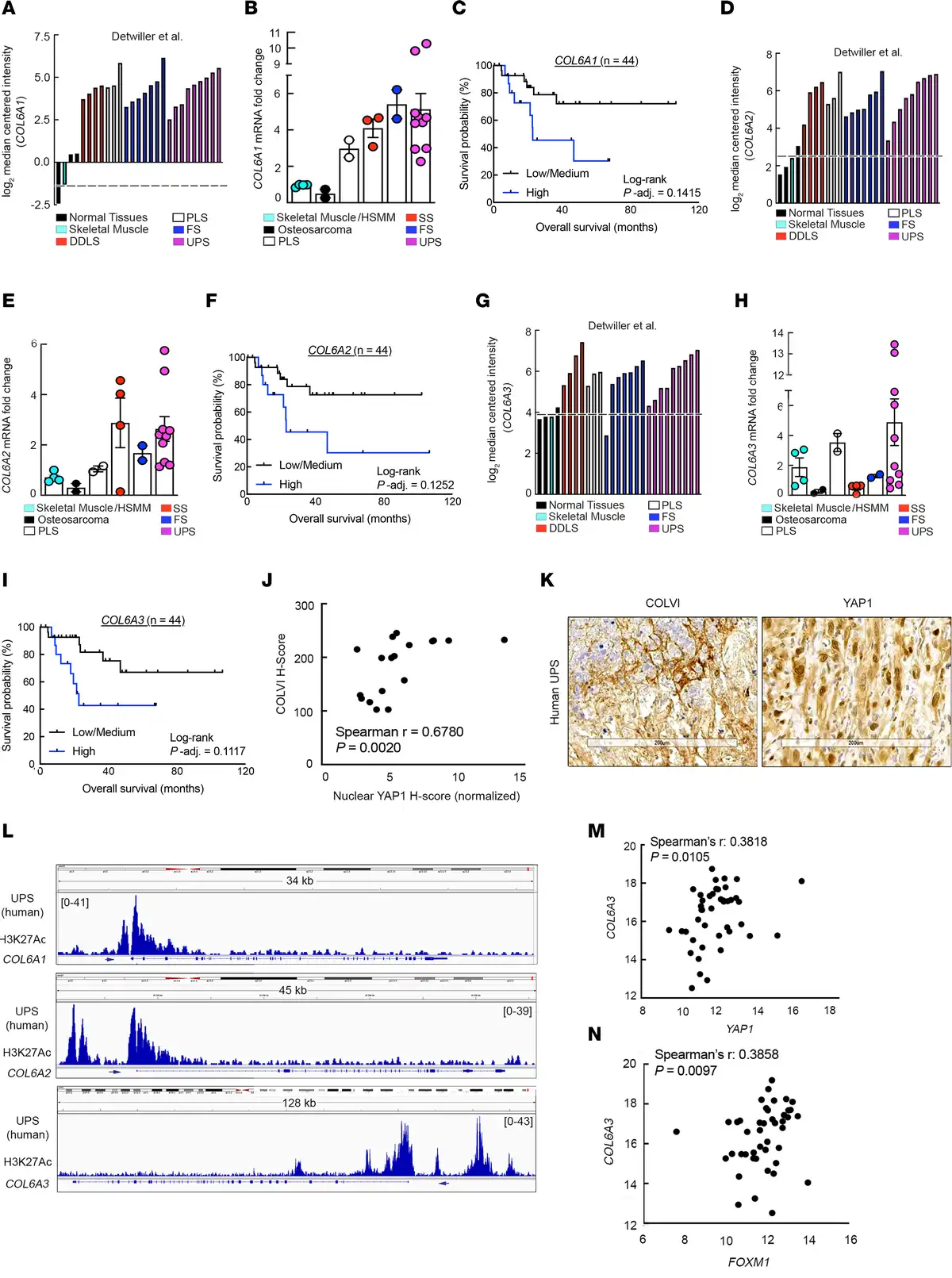 (A) COL6A1 gene expression levels in specimens from the Detwiller et al. sarcoma data set (Oncomine) (). DDLS, dedifferentiated liposarcoma; PLS, pleomorphic liposarcoma; FS, fibrosarcoma. (B) qRT-PCR analysis of COL6A1 expression in human sarcoma and normal skeletal muscle tissue specimens (Hospital of the University of Pennsylvania [HUP]). SS, synovial sarcoma. (C) Kaplan-Meier overall survival curves of UPS patients in TCGA-SARC stratified by intratumoral COL6A1 gene expression levels. (D) COL6A2 gene expression levels in specimens from the Detwiller et al. sarcoma data set. (E) qRT-PCR analysis of COL6A2 expression in human sarcoma and normal skeletal muscle tissue specimens (HUP). (F) Kaplan-Meier overall survival curves of UPS patients in TCGA-SARC stratified by intratumoral COL6A2 gene expression levels. (G) COL6A3 gene expression levels in specimens from the Detwiller et al. sarcoma data set. (H) qRT-PCR analysis of COL6A3 expression in human sarcoma and normal skeletal muscle tissue specimens (HUP). (I) Kaplan-Meier overall survival curves of UPS patients in TCGA-SARC data set stratified by intratumoral COL6A3 gene expression levels. For C, F, and I, tertiles (low, medium, high) represent one-third of patients. (J) Correlation of COLVI and nuclear YAP1 immunostaining in UPS tumor specimens (HUP). Each point represents an individual specimen. (K) Representative IHC images from J. Scale bars: 200 μm. (L) Publicly available ChIP-Seq data (GSE97295) of COL6A1, COL6A2, and COL6A3 promoter H3K27 acetylation in human UPS samples (HUP). (M and N) Correlation of YAP1 with COL6A3 (M) and FOXM1 (N) gene expression in UPS tumors from TCGA-SARC.