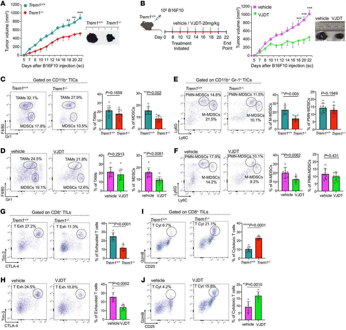 TREM1 deficiency and anti-TREM1 treatment diminish B16F10 tumor growth by altering tumor immune infiltrates.