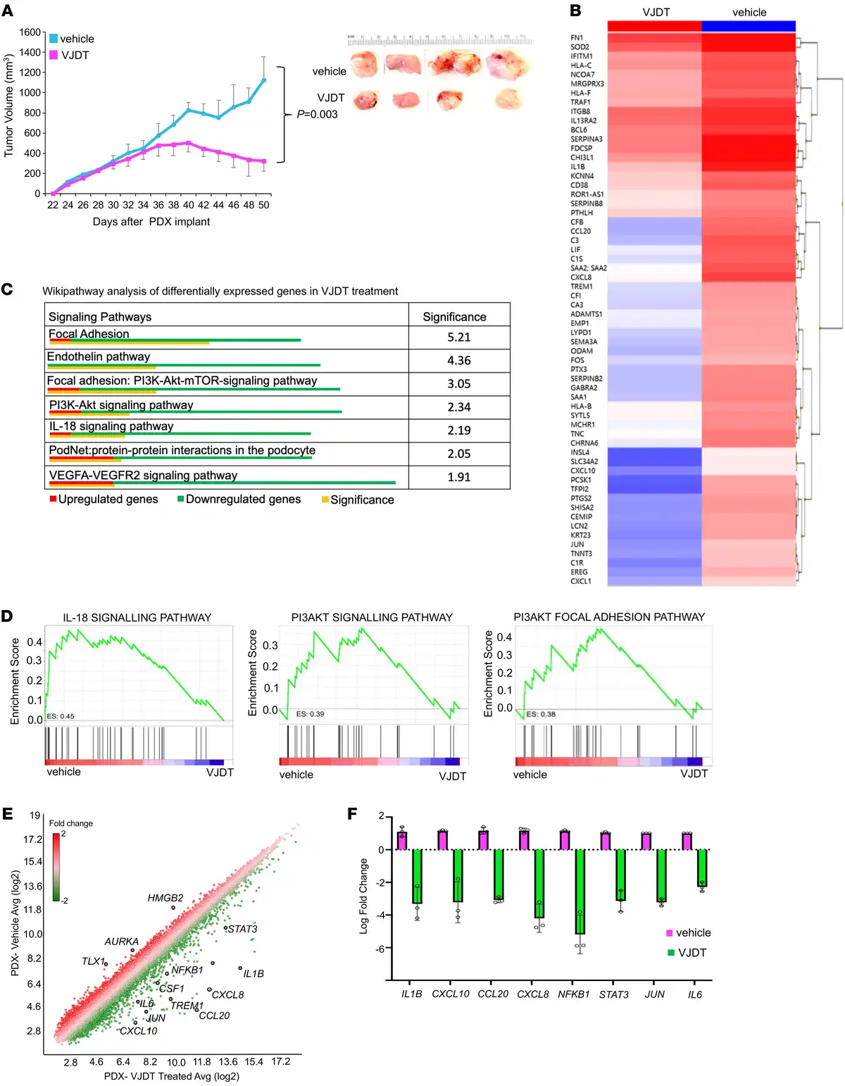 We further evaluated the in vivo efficacy of the small molecule TREM1 inhibitor VJDT against a human skin cutaneous melanoma PDX model. NSG mice bearing PDX tumors were randomized to treatment with vehicle or VJDT (20 mg/kg). Compared with the control group, the treatment with VJDT significantly suppressed the growth of melanoma PDX tumors (Figure 10A). To identify potential targets of VJDT, we performed microarray gene expression profiling on melanoma PDX tumors treated with VJDT compared with untreated (Figure 10B). We next performed pathway analysis to identify the critical signaling networks most affected by VJDT treatment. Remarkably, many cellular proliferation and migration signaling pathways, such as the PI3K-Akt and the PI3K-Akt-mTOR focal adhesion pathways, were inhibited by VJDT (Figure 10C), suggesting that TREM1 contributes to tumorigenesis. In addition, GSEA showed selective enrichment of key genes involved in the IL-18, PI3K-Akt, and PI3K-Akt focal adhesion pathways in the vehicle group, which was abrogated by VJDT treatment (Figure 10D). Marked downregulation of expression of TREM1 and known TREM1 target genes (NFKB1, CCL20, IL6, and CXCL8) was determined in melanoma PDX models treated with VJDT (Figure 10E). Further, VJDT treatment strongly downregulated genes associated with cell proliferation (STAT3, NFKB1, and JUN) and those associated with immune cell infiltration (CCL20, CXCL8, CXCL10, and IL1B) (–) (Figure 10E). The regulation of expression of selected genes was validated by quantitative real-time PCR analyses (Figure 10F). Together, these results indicate a global suppression of genes essential for human tumorigenesis during pharmacological inhibition of TREM1 and support the potential therapeutic usefulness of VJDT.