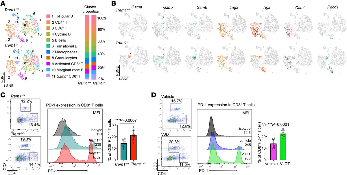 To analyze the impact of TREM1 on tumor growth and immune responses, we used 2 transplantable syngeneic mouse tumor models, the B16F10 melanoma and MCA 205 fibrosarcoma cell lines, known to be associated with a microenvironment infiltrated with myeloid and lymphoid cells (, ). In Trem1+/+ mice, these tumors grew rapidly, but their growth was significantly attenuated in Trem1–/– mice (Figure 1A and Supplemental Figure 1A; supplemental material available online with this article; https://doi.org/10.1172/JCI167951DS1). To demonstrate the therapeutic benefit of pharmacological inhibition of TREM1, we developed VJDT, a novel TREM1 small molecule inhibitor that effectively blocks TREM1 signaling (VJDT design and development and toxicity studies are described in Methods and Supplemental Figure 2, A–L). VJDT treatment significantly delayed the growth of both tumor types (Figure 1B and Supplemental Figure 1B). We next examined the effect of TREM1 deficiency and its antagonism by VJDT on the tumor immune infiltrates. Within the myeloid compartment, lack of TREM1 signaling reduced the number of TAMs (CD11b+F4/80+Gr1–) () while significantly decreasing the proportion of MDSCs (CD11b+F4/80–Gr1+) (Figure 1, C and D, Supplemental Figure 1, C and D, and Supplemental Figure 3A). Furthermore, within the MDSC population, only the monocytic MDSCs (M-MDSCs; CD11b+F4/80–Gr1+Ly6ChiLy6G–) but not the polymorphonuclear MDSCs (PMN-MDSCs; CD11b+F4/80–Gr1+Ly6CloLy6G+) (, ) were attenuated by TREM1 antagonism (Figure 1, E and F, Supplemental Figure 1, E and F, and Supplemental Figure 3B). In addition, among the tumor-infiltrating lymphocytes (TILs), TREM1 deficiency led to significant attenuation in exhausted CD8+ T (T Exh) cells (CD8+Tim-3+CTLA-4+) () (Figure 1, G and H, Supplemental Figure 1, G and H, and Supplemental Figure 3C) while increasing the proportion of cytotoxic CD8+ T (T Cyt) cells (CD8+GzmB+CD25+) () (Figure 1, I and J, Supplemental Figure 1, I and J, and Supplemental Figure 3D). CD3+CD4+ T cells were equally represented in all groups; in contrast, CD8+ T cells were selectively enriched within the TREM1-deficient TME. To gain a global understanding of the impact of TREM1 silencing, we analyzed the CD45+ tumor-infiltrating cells (TICs) of B16F10 tumor-bearing Trem1+/+ and Trem1–/– mice. Utilizing the 10× genomics chromium platform, we analyzed approximately 5,390 cells per sample with a coverage rate of 15,493 genes per cell. Dimensional reduction by t-distributed stochastic neighbor embedding (t-SNE) identified 11 distinct clusters of TICs within the melanoma TME (Figure 2A). These clusters were classified based on expression of canonical gene markers from a comparative data set in the Immunological Genome Project (ImmGen) Consortium. TREM1 silencing led to expansion of Granzyme B-expressing CD8+ T cells in Cluster 11 while decreasing the frequency of CD4+ T cells in Cluster 2 within the TME (Figure 2A). Furthermore, genes associated with T cell cytotoxicity, such as Gzma, Gzmk, and Gzmb (), showed increased expression; in contrast, markers of T cell exhaustion, including Lag3, Tigit, and Ctla4 (), were diminished within the Trem1–/– TME (Figure 2B). Interestingly, in scRNA-Seq analysis, one of the T cell markers, Pdcd1 (, ), was elevated during TREM1 silencing, and our flow cytometry data further confirmed this observation, wherein TREM1 deficiency or VJDT treatment induced significant increases in tumor-infiltrating CD8+PD-1+ T cells within the TME (Figure 2, C and D and Supplemental Figure 1, K and L). As assessed by scRNA-Seq analysis, other TIC populations, such as B cells, were not affected by TREM1 silencing, while macrophages and granulocytic cells were chronically under-represented in this experiment for comparative analysis. However, supporting data from flow cytometry and scRNA-Seq analysis suggested that TREM1 deficiency globally remodels the TME toward a uniquely more immunopermissive state by diminishing M-MDSC infiltration and CD8+ T cell exhaustion while promoting CD8+ T cell infiltration. Further, our data shows augmented Pdcd1 expression on CD8+ T cells within the Trem1–/– TME, suggesting that pharmacological inhibition of TREM1 could be a potential therapeutic strategy to overcome resistance in PD-1 immune checkpoint therapy while boosting antitumor immune responses.