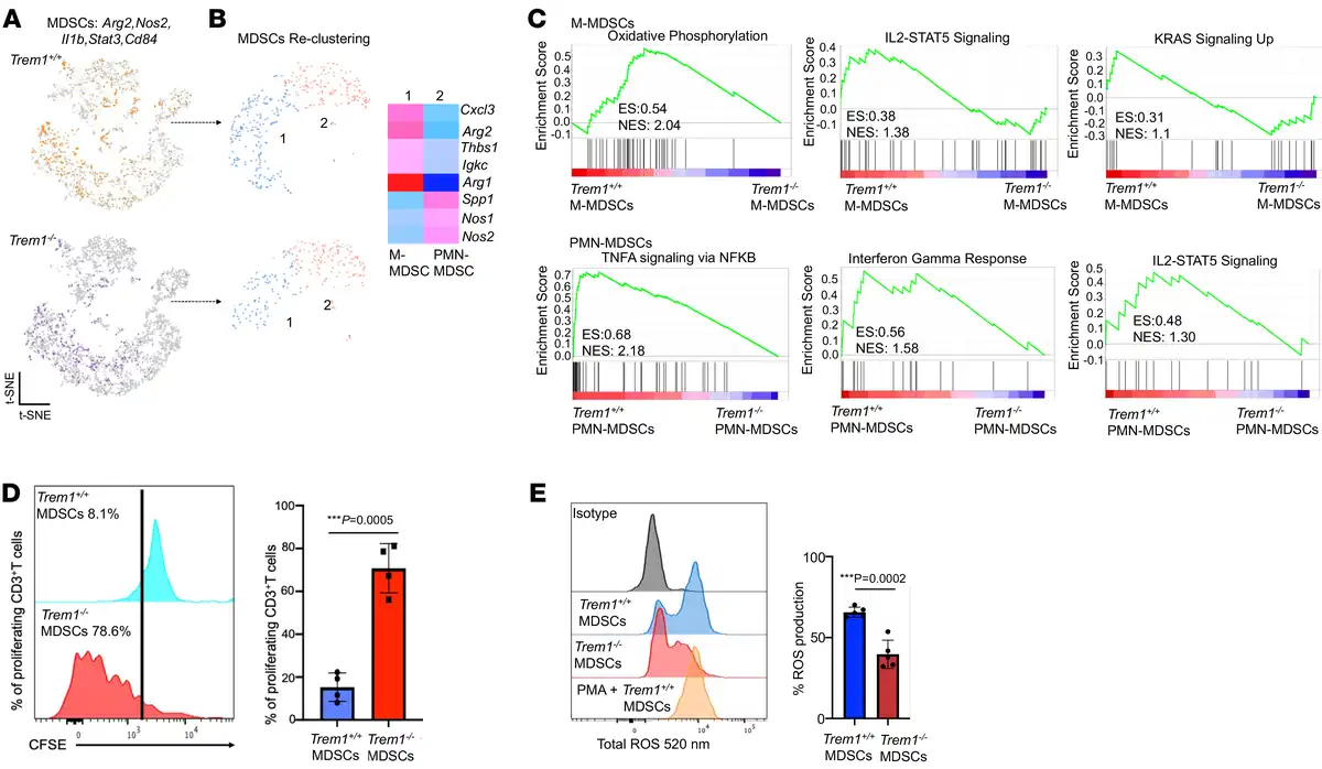 Our scRNA-Seq analysis of CD45+ TICs in the melanoma model demonstrated a substantial alteration of the tumor immune landscape under Trem1 silencing. Additionally, to comprehensively characterize the impact of TREM1 deficiency specifically within the tumor myeloid populations, we selectively enriched the CD45+CD11b+ tumor–infiltrating myeloid cells from tumor-bearing Trem1+/+ and Trem1–/– mice for scRNA-Seq analysis. We assayed up to 4,200 isolated CD45+CD11b+ cells from the TME of the B16F10 melanoma model with a coverage rate of 18,854 genes per cell. t-SNE analysis resolved 8 distinct cell clusters of tumor-infiltrating myeloid cell types (Figure 3A). The different subsets of macrophages and granulocytic populations within the tumor infiltrates were annotated using the expression of canonical gene markers derived from a comparable data set from the ImmGen Consortium. Macrophage classical markers such as Marco and Ly6c2 (, ) were higher in clusters 1, 2, 5, and 7 (Figure 3, B and E). Cluster 1 exhibited characteristics of infiltrating monocytes expressing monocytic markers such as Ccr2 and Cx3cr1, indicating that these cells had recently migrated from the blood (), while cluster 2 was defined as TAMs that were positive for Cd68 and Cd163 (, ) (Figure 3, B and E). Cluster 7 of the macrophage subset exhibited Mki67, a unique marker for the cell cycle, and was defined as cycling macrophages (, ) (Figure 3, B and E). Clusters 3, 4,5, and 6 were categorized as neutrophils due to their relatively higher expression of Ly6g2, S100a8, and MMP8 (). Cluster 8 was identified as dendritic cells, due to elevated expression of Flt3, which was poorly represented in both groups. Our data demonstrated that TREM1 deficiency was associated with decreased frequency of tumor-infiltrating Ccr2 and Cx3cr1 monocytes of cluster 1 (Figure 3, B and E). Their decrease in Trem1–/– mice suggests an attenuation of the cytokine/chemokine signaling network essential for tumor infiltration. In addition, Mki67 cycling macrophages that expressed high levels of Trem1 were dramatically diminished in the Trem1–/– group, indicating the indispensable role of TREM1 in survival and maintenance of these cells (Figure 3B). Interestingly, TREM1 deficiency led to an increase in Cxcr2-positive infiltrating neutrophils (Cluster 3) as well as the Lrg1-expressing activated neutrophils (Cluster 5), while diminishing the frequency of MMP8-expressing granulocytic neutrophils. These considerable changes in the neutrophil clusters during Trem1 silencing are indicative of their integral role in neutrophil recruitment and activation (Figure 3B). A heatmap of the normalized expression of selected genes in each cluster showed that expression of Ccr2 and Cx3cr1, which encode the major chemokine receptors involved in macrophage recruitment (, ), along with their ligands Ccl2 and Cxcl2 (, ), were downregulated in the Trem1–/– B16F10 tumors (Figure 3C). Moreover, proinflammatory cytokine transcripts such as Il1b, Ccl7, Cxcl12, and Il6 () and genes associated with immunosuppression, including Mrc1, Arg1, and Mertk (, ), were substantially elevated in all clusters within the Trem1+/+ tumors compared with the Trem1–/– tumors (Figure 3D). These data, together with flow cytometry analysis (Figure 1, C and E), suggest that the tumor-infiltrating myeloid cell landscape is altered in the TREM1-deficient TME. Overall, our findings suggest that TREM1 deficiency leads to a considerable reconditioning of the tumor-myeloid landscape by inhibiting macrophage recruitment. Next, we characterized the impact of TREM1 deficiency on MDSC populations within tumor infiltrates. We defined MDSCs as Arg2, Nos2, Il1b, Stat3, and Cd84–expressing cells (–) that were diffusely represented in various clusters as they could not be categorized separately as a distinct cell population (Figure 4A). Reclustering analysis of MDSCs revealed that these cells were composed of 2 distinct clusters, clusters 1 and 2. A comparative expression profile of specific markers between the 2 groups revealed that Cluster 1 can be categorized as M-MDSCs due to elevated expression of Cxcl3, Arg1, and Arg2, while Cluster 2 is classified as PMN-MDSCs due to elevated expression in Nos1, Nos2, and Spp1 (Figure 4B). A reduced infiltration of M-MDSCs was determined in the TME of TREM1-deficient mice (Figure 4, A and B). Moreover, Gene Set Enrichment Analysis (GSEA) revealed that TREM1 deficiency in M-MDSCs attenuated the oxidative phosphorylation and IL-2 signaling pathways, which have been associated with both MDSC survival and T cell suppressor activity (, ). In addition, in PMN-MDSCs, Trem1 silencing inhibited the IFN-γ and TNF signaling pathways (Figure 4C). Our observations hypothesize a role of TREM1 in controlling the inhibitory capacity of these immunosuppressive cells. To test this hypothesis, we compared the immunosuppressive capacity of MDSCs isolated from Trem1+/+ and Trem1–/– tumor-bearing mice. Tumor-infiltrating MDSCs harvested from TREM1-deficient mice exhibited diminished suppressive capacity on the proliferation of CD3+ T cells activated with anti-CD3/anti-CD28 compared with their TREM1-positive counterparts (Figure 4D). Furthermore, ROS formation assays showed that MDSCs isolated from Trem1–/– tumor-bearing mice had significantly decreased ROS formation capabilities compared with Trem1+/+ MDSCs (Figure 4E). Collectively, these data suggested that TREM1 deficiency limits tumor progression by reconditioning the myeloid infiltrate in the TME via reduced accumulation and immunosuppressive capacity of macrophages and MDSCs.