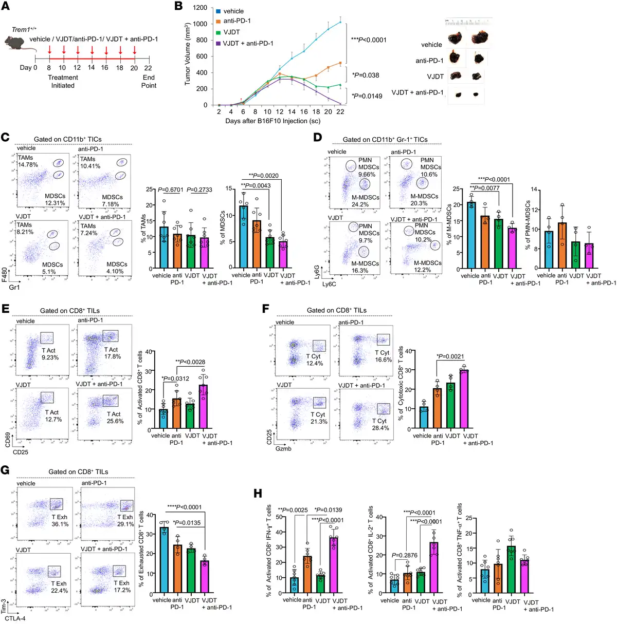 (A) Schematic illustrates various treatment regimens on B16F10 tumors in Trem1+/+ mice. Melanoma-bearing Trem1+/+ mice were treated with either vehicle (combination of DMSO and IgG2a Isotype) or 200 μg anti-PD-1 antibody or 20 mg/kg VJDT or a combination of both from day 8 until day 20, on every alternate day of tumor progression. (B) Tumor growth curves expressed as overall tumor volume monitored every alternate day (n = 7 mice/group, mean ± SEM). Representative microscopic images of tumors from the indicated groups on day 22 are shown. (C–H) Tumors were harvested on day 22. Flow cytometry analysis of gated immune subset cells are shown (plots depict 1 representative experiment performed in triplicate, n = 4–7mice/group, mean ± SD). (C) Frequency of CD11b+F4/80+Gr-1– TAMs, CD11b+F4/80–Gr-1+ MDSCs, and (D) CD11b+Gr-1+Ly6ChiLy6G– M-MDSCs and CD11b+ Gr1+Ly6CloLy6G+ PMN-MDSCs in the TME of the indicated groups. (E) Frequency of activated CD8+CD69+CD25+ T cells, (F) cytotoxic CD8+GzmB+CD25+ T cells, and (G) exhausted CD8+Tim-3+CTLA-4+ T cells within the TME. (H) Frequency of tumor-infiltrating CD8+CD25+ T cells expressing either IFN-γ, IL-2, or TNF-α. **P < 0.01; ***P < 0.001; ****P < 0.0001 by 2-way ANOVA for multiple comparison of longitudinal tumor growth between groups (B [tumor growth]) or 2-tailed Student’s t test for comparison between 2 groups (C–H).