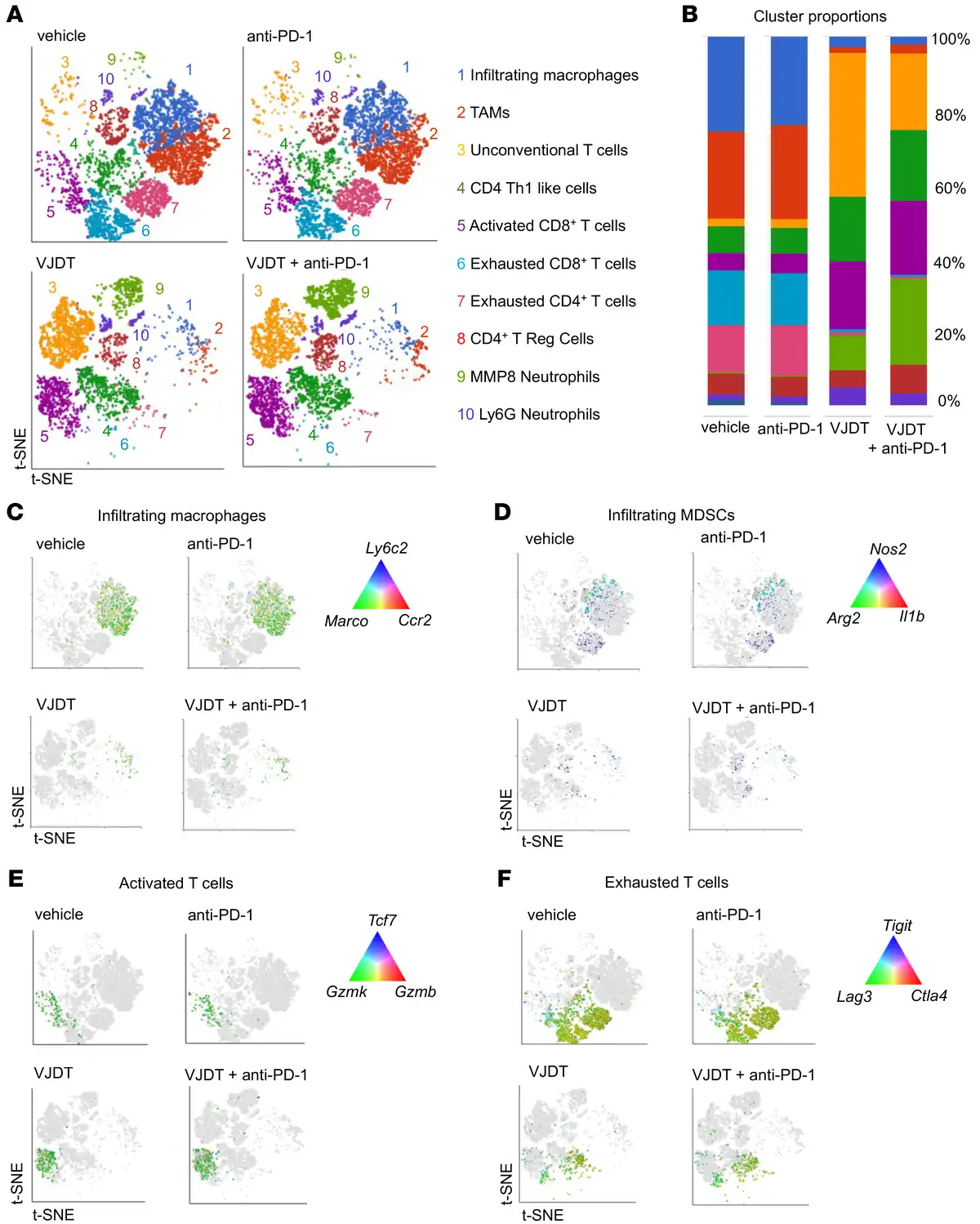 scRNA-Seq of tumor-infiltrating CD45+ immune cells sorted from TME of B16F10 melanoma-bearing Trem1+/+ mice receiving either VJDT, anti-PD-1, both in combinational treatment, or vehicle. For each experimental group, 3 biological replicates were pooled. (A) scRNA-Seq data analyzed using Partek Flow to generate t-SNE plot showing differential cell clusters and their frequencies within the TME. Cluster identities were annotated based on expression of key gene signatures as described in Methods. (B) Bar graph depicts cluster proportions associated with each treatment group. (C–F) t-SNE plots characterize changes during treatment in the expression profile of key genes involved in (C) infiltrating macrophages, (D) infiltrating MDSCs, (E) activated T cells, and (F) exhausted T cells across the indicated groups.