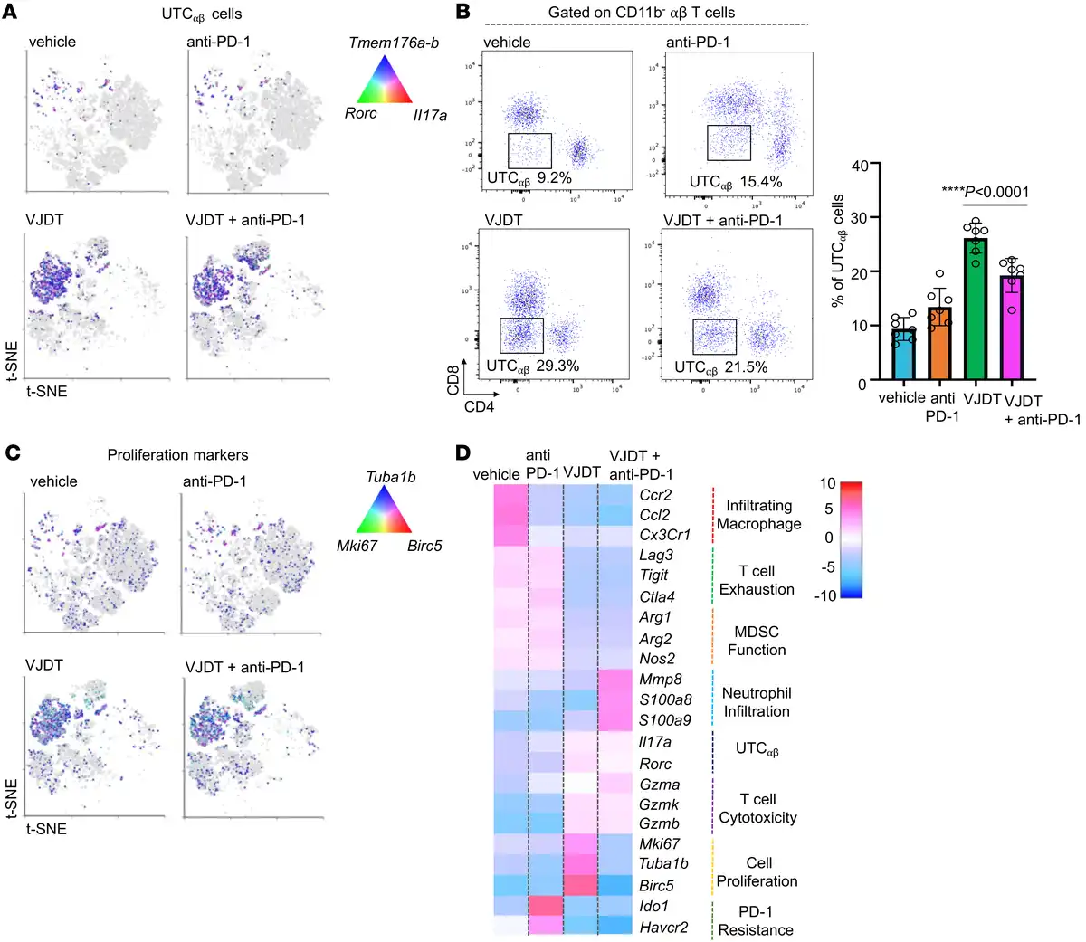 (A) t-SNE plot describes expression profile of key gene markers for UTCαβ cells in melanoma-bearing Trem1+/+ mice receiving either VJDT, anti-PD-1, both in combinational treatment, or vehicle. For each experimental group, 3 biological replicates were pooled. (B) Flow cytometry analysis shows frequency of UTCαβ cells within the TME of Trem1+/+ mice across indicated groups (n = 7 mice/group, mean ± SD). (C) t-SNE plot describes global expression profile of proliferation markers across indicated groups. (D) Heatmap depicts differential transcription profiles of tumor-infiltrating CD45+ immune cells sorted from TME of indicated groups. The differentially expressed genes associated with effector function are shown. ****P < 0.0001 by 1-way ANOVA using Dunnett’s multiple comparison test (B).
