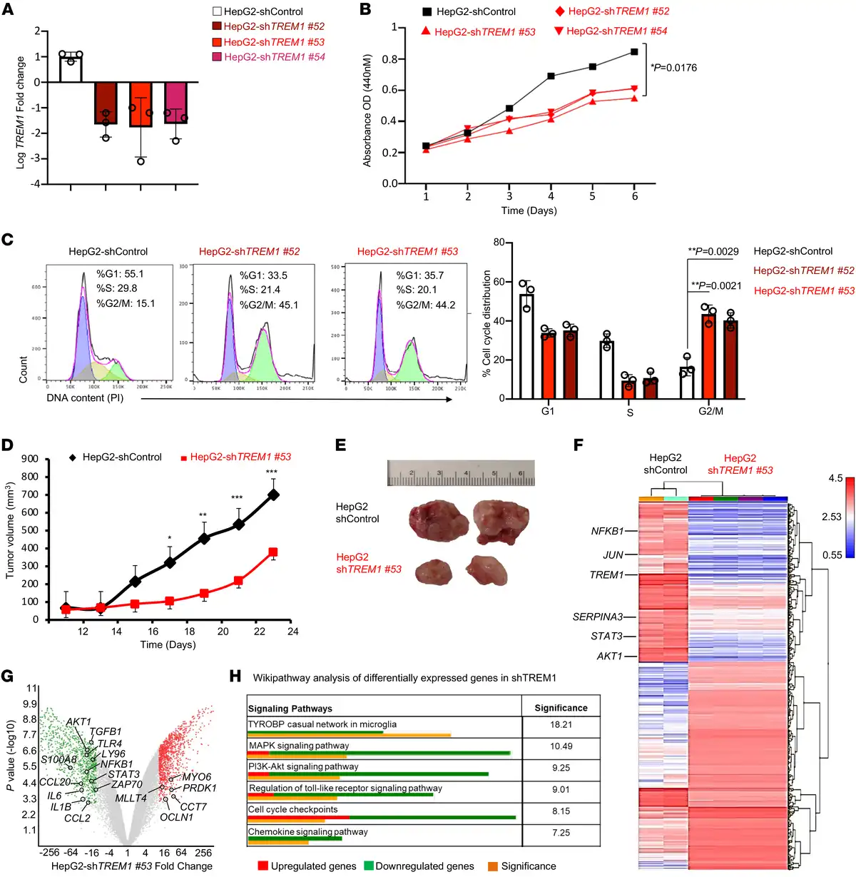 TREM1 expression is closely associated with tumorigenesis in selected human tumors (, ). Although the intrinsic role of TREM1 in cancer cells remains unclear, we have observed TREM1 expression in several human cancer cell lines, such as HepG2, Huh7, U87, and U251 (Supplemental Figure 5A). To better characterize the role of TREM1 expressed intrinsically in cancer cells, we established several stable HepG2 clones with confirmed TREM1 knockdown through RT-qPCR (Figure 8A). Interestingly, cell proliferation was attenuated in all the HepG2 clones with TREM1 knockdown compared with the clones treated with the scrambled controls (Figure 8B). Cell cycle analysis of 2 of these knockdown HepG2 clones (no. 52 and no. 53) revealed significant G2/M cell cycle arrest (Figure 8C); further, inhibition of TREM1 by VJDT treatment at 50 μM similarly induced G2/M arrest, while 10 μM treatment induced S phase arrest in HepG2 cells (Supplemental Figure 5B). The observed G2/M arrest in TREM1-deficient cells is consistent with the described role of TREM1 in modulating the energy metabolism required for the G2-to-M transition under stress conditions (). Furthermore, pharmacological inhibition of TREM1 by VJDT treatment significantly attenuated cell proliferation and migration in HepG2 and B16F10 cells (Supplemental Figure 5, C–F). Interestingly, VJDT inhibited the growth of B16F10 tumors implanted in Trem1–/– mice; however, their effect on TICs was minimal (Supplemental Figure 6, A and B). These results suggested that pharmacological inhibition of TREM1 can directly restrain tumor growth independent of its role in modulating the TME. To further characterize the tumor-promoting role of TREM1 in vivo, we performed xenograft studies using immunodeficient NSG mice. We validated that knockdown of TREM1 on HepG2 cells significantly restricted tumor growth compared with the control group (Figure 8, D and E). The transcriptomic expression profiles of shTREM1 and shControl HepG2 cells were compared by microarray analysis. Knockdown of TREM1 led to downregulation of key genes involved in cell proliferation, such as JUN, STAT3, NFKB1,and AKT1 (Figure 8, F and G). Other genes inhibited by TREM1 knockdown included chemokines such as CCL2 and CCL20, which are involved in macrophage recruitment (, ), and cytokines IL1B, IL2, and IL6, which play a pivotal role in inflammatory responses (–). Wikipathway analysis of shTREM1 HepG2 tumors revealed significant downregulation of the PI3K-Akt and MAPK signaling pathways (Figure 8H), which are critical for oncogenesis (). Additionally, TLR4 and LY96, which are genes in the TLR signaling pathway that promote cell survival and proliferation in hepatocellular carcinoma (, ), were significantly downregulated in shTREM1 HepG2 tumors (Figure 8, G and H).