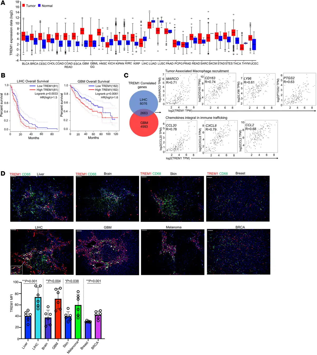 We explored the Cancer Genome Atlas (TCGA) database to assess TREM1 expression in human tumors and normal tissues. As expected, TREM1 transcript levels were elevated in almost all human tumor cohorts compared with their corresponding normal tissues (Figure 9A). We next examined the association between TREM1 expression and overall survival by utilizing the Cox regression model on the various tumor types. With a 50% quantile as cutoff for TREM1 expression, only the LIHC and GBM cohorts exhibited significant associations between high TREM1 expression and worse overall survival (Figure 9B). To better understand the impact of TREM1 in these 2 carcinomas, we identified genes that correlated with TREM1 expression in both tumor types. High positive correlations were identified between TREM1 expression and several chemokines integral to immune trafficking (, ) (CCL20, R=0.78; CXCL8, R=0.79; and CCL2, R=0.68), as well as genes involved in myeloid cell recruitment within the TME (–) (MARCO, R=0.78; CD163, R=0.71; LY96, R=0.61; and PTGSR, R= 0.63; Figure 9C). To further validate findings from the TCGA database, we analyzed TREM1 protein expression in selected human normal and tumor tissue sections by immunofluorescence staining. We detected significantly elevated TREM1 protein within the TME of LIHC, GBM, breast cancer, and melanoma (Figure 9D). TREM1 expression in LIHC was concentrated around the macrophage-specific CD68 marker, implying the presence of infiltrating TREM1+ macrophages in these tumors. Other tumors, such as GBM, exhibited high levels of TREM1 expression independent from their CD68+ microglial cells (Figure 9D), indicating that these neoplasms were intrinsically TREM1 positive. Together, our results highlight that TREM1 expression is associated with various human carcinomas and plays a critical role in modulating tumor immune infiltrates, making it a candidate for therapeutic intervention.