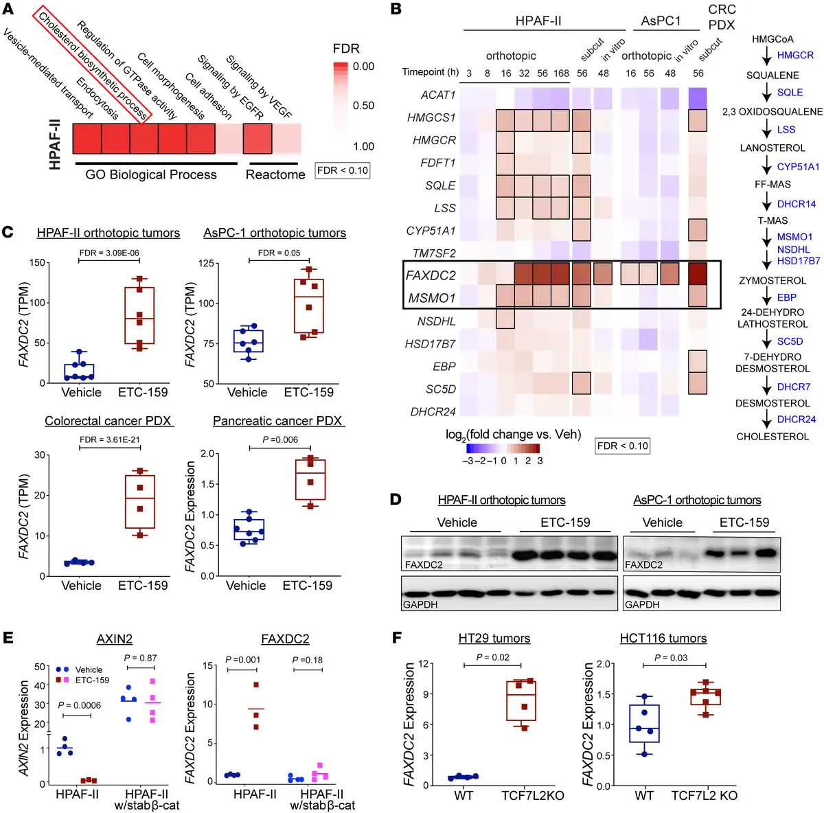 (A) Wnt inhibition upregulates genes regulating cholesterol biosynthesis. Pharmacologic Wnt inhibition with ETC-159 in HPAF-II orthotopic xenografts upregulates 4,350 genes that are grouped into temporal clusters (n = 4–6 mice per group). GO Biological Process and Reactome analysis of the Wnt-repressed genes highlights processes including cholesterol biosynthesis, vesicle-mediated transport, and EGFR/VEGF signaling (hypergeometric test, FDR < 10%). (B) Wnt signaling represses genes encoding enzymes in the cholesterol biosynthesis pathway. Left: Wnt inhibition with ETC-159 increases expression of multiple cholesterol biosynthesis pathway genes in 3 independent systems: HPAF-II and AsPC-1 orthotopic xenografts and cells in culture and colorectal PDX (14) (n = 4–6 tumors per group). Boxed genes show significant change in expression (FDR < 0.10). Right: Cholesterol biosynthesis pathway. (C) Wnt inhibition increases FAXDC2 expression in multiple Wnt-addicted cancer models: ETC-159–treated HPAF-II, AsPC-1 orthotopic tumors, and Wnt-addicted colorectal and pancreatic cancer PDX models have 2- to 10-fold higher FAXDC2 expression compared with control tumors. Relative expression from RNA-Seq in TPM or quantitative reverse transcription PCR (qRT-PCR) is shown. Each data point represents an independent tumor, n = 5–6 per group (hypergeometric test, FDR < 10%, or Mann-Whitney test). (D) ETC-159 treatment increases FAXDC2 protein abundance in tumors. Protein lysates from HPAF-II and AsPC-1 orthotopic xenografts from vehicle- or ETC-159–treated mice were probed with FAXDC2 or GAPDH antibodies. Each lane represents tumor lysate from an individual mouse. (E) Stabilized β-catenin suppresses FAXDC2 expression despite upstream Wnt inhibition by ETC-159. Mice bearing xenografts from control HPAF-II cells or cells expressing stabilized β-catenin were treated with ETC-159 or vehicle for 56 hours. FAXDC2 and AXIN2 mRNA were quantitated by qRT-PCR and normalized to both ACTB and EPN1. AXIN2 upregulation is a control for stabilized β-catenin activity. (F) Genetic inhibition of Wnt signaling by TCF7L2 knockout in HT29 and HCT116 colon cancer xenografts increases FAXDC2 expression 2- to 8-fold in comparison with WT controls. (E and F) Each data point represents an independent tumor. Unpaired t test was used to calculate P values.