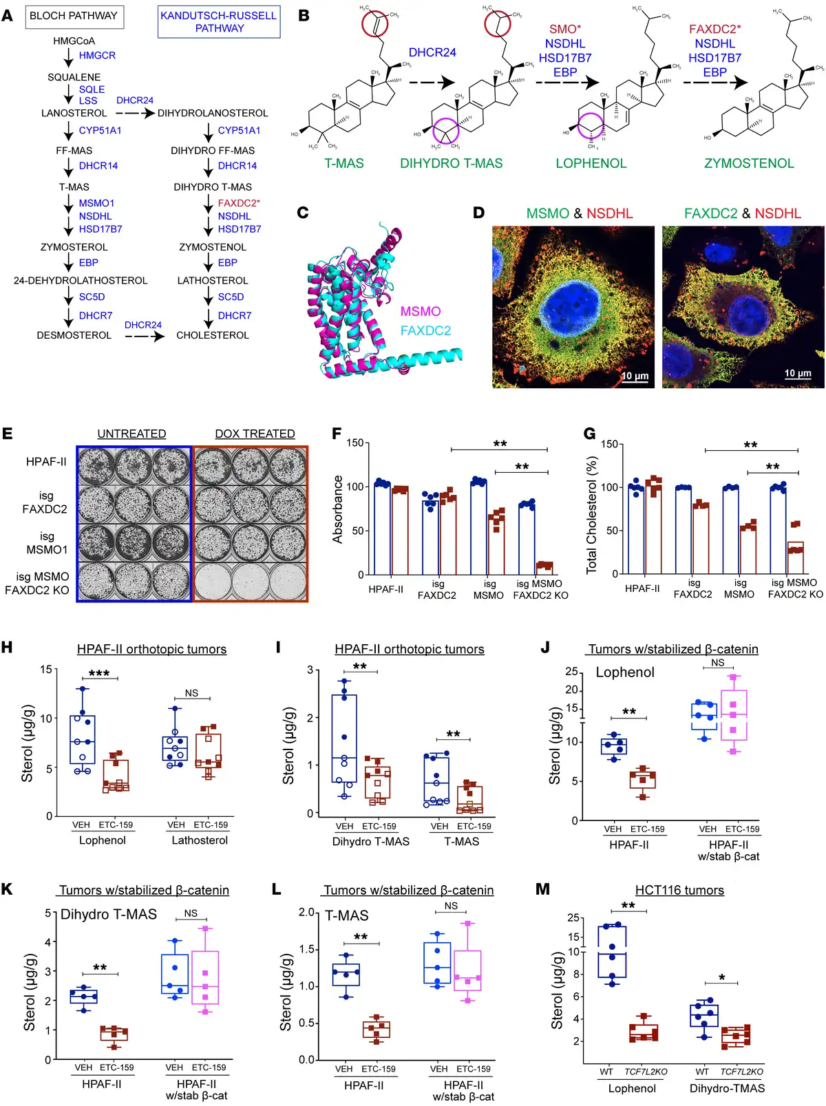 (A) Postlanosterol cholesterol biosynthesis via Bloch and KR pathways, highlighting key steps and associated enzymes. *Proposed location of FAXDC2 in the pathway. (B) Conversion of T-MAS to zymostenol, highlighting reduction at C24 and demethylation at C4 involving sterol methyl oxidase (SMO). *SMO indicates either MSMO1 or FAXDC2 sterol methyl oxidase. (C) MSMO1 and FAXDC2 structures predicted by AlphaFold show considerable homology (root-mean-square deviation of atomic positions 1.36 Å). (D) Like MSMO1, FAXDC2 colocalizes with NSDHL in the SER. Epitope-tagged MSMO1, NSDHL, and FAXDC2 constructs were expressed in HeLa cells, and their localization was visualized by staining with fluorescence-tagged anti-epitope antibodies. (E–G) Combined knockdown of FAXDC2 and MSMO1 reduces total cholesterol levels and prevents cellular proliferation. HPAF-II cells, HPAF-II cells with doxycycline-inducible (DOX-inducible) single-guide (isg) RNAs targeting FAXDC2 or MSMO1 alone, and FAXDC2-KO cells with DOX-isg targeting MSMO1 were cultured for 10 days. (E) Representative images of crystal violet staining from 3 independent experiments. (F) Crystal violet dye was solubilized, and absorbance was measured at 570 nm. (G) Total cholesterol levels were significantly reduced in the FAXDC2 and MSMO1 double-KO cells compared with the single knockouts. (H and I) ETC-159 treatment reduces C4-methyl sterols in HPAF-II orthotopic tumors with high FAXDC2 expression. Sterol levels in mice treated with vehicle or ETC-159 were measured by GC-MS. Data from individual tumor samples (n = 4–5 per group) from 2 independent experiments were combined to calculate P values, controlling for batch effects. (J–L) Stabilized β-catenin, which represses FAXDC2, increased C4-methyl sterol levels independent of upstream Wnt signaling inhibition. C4-methyl sterol levels in HPAF-II tumors with and without stabilized β-catenin from mice treated with ETC-159 or vehicle were analyzed by GC-MS. Each point denotes an individual tumor, n = 4–5 per group. (M) C4-methyl sterols are reduced in TCF7L2-KO HCT116 xenografts compared with control tumors. Sterol levels were measured by GC-MS. Each point depicts an individual tumor sample. P values were calculated by Mann-Whitney U test (G and M) and unpaired t test (J–L). *P ≤ 0.05, **P ≤ 0.01, ***P ≤ 0.001.