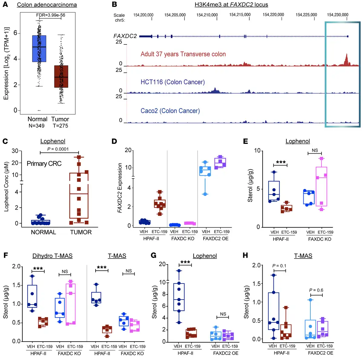 Figure 3. (A–C) Primary Wnt-high colorectal cancers have repressed FAXDC2 expression and high levels of lophenol. (A) FAXDC2 is repressed in primary colorectal cancers compared with corresponding normal tissues. Expression of FAXDC2 was compared in normal tissues versus tumor tissues using GEPIA 2.0 (TCGA and GTEx data sets). (B) H3K4me3, a marker of active transcription, marks the FAXDC2 genomic locus in the normal colon but is absent in cancer cell lines. Data from Cistrome Data Browser. (C) Lophenol is markedly elevated in primary colorectal cancers. Sterol abundance was measured in primary colorectal cancers and adjacent normal tissue by GC-MS. Each point represents lophenol levels in an individual tumor, n = 12 tumors per group. (D–H) Manipulation of FAXDC2 expression regulates C4-methyl sterol abundance. (D) Relative expression of FAXDC2 in HPAF-II, FAXDC2-KO, and FAXDC2-OE xenografts as measured by qRT-PCR. (E and F) Knockout of FAXDC2 abrogates the ETC-159 treatment–induced change in the abundance of C4-methyl sterols. Sterol abundance was measured in HPAF-II and FAXDC2-KO xenografts from control and ETC-159–treated mice. Each point represents the level of indicated methyl sterols measured using GC-MS in an individual tumor sample, n = 4–5 per group. (G and H) FAXDC2 overexpression reduces lophenol and T-MAS to levels comparable to those in the Wnt-inhibited tumors. Sterol abundance was measured in HPAF-II and FAXDC2-OE xenografts from control and ETC-159–treated mice. Each point represents the abundance of methyl sterols measured using GC-MS in an individual tumor sample, n = 4–5 per group. P values were calculated by Mann-Whitney U test for all graphs in this figure. ***P ≤ 0.001.