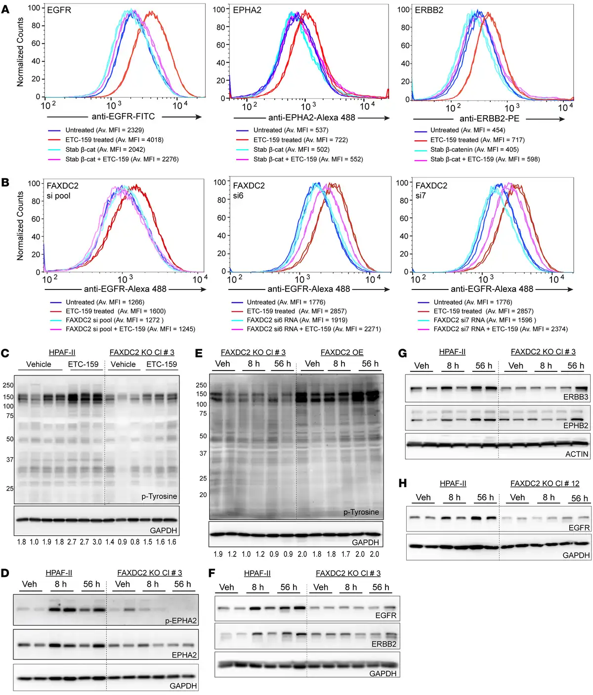 Figure 6. (A) Stabilized β-catenin prevents multiple RTKs from moving to the cell surface upon treatment with ETC-159. Cell surface abundance of EGFR, ERBB2, and EPHA2 was assessed as before in HPAF-II cells with or without stabilized β-catenin. Cells were treated with DMSO or 100 nM ETC-159 for 72 hours before staining with fluorescent tagged antibodies. Each histogram represents ~50,000 cells. Data are representative of 3 independent experiments, and 2 replicates are shown. (B) Knockdown of FAXDC2 prevents Wnt inhibition–mediated increase in EGFR cell surface abundance. HPAF-II cells were transfected with a pool of 4 siRNAs or 2 independent siRNAs (si6 and si7) against FAXDC2 for 24 hours, followed by treatment with ETC-159 for 72 hours. The cells were then stained with Alexa Fluor 488–conjugated anti-EGFR antibody and analyzed by flow cytometry. Data are representative of 3 independent experiments, and 2 replicates are shown. (C and D) Knockout of FAXDC2 in HPAF-II tumors prevents Wnt inhibition–mediated increase in tyrosine phosphorylation and p-EPHA2 levels. Protein lysates from HPAF-II or FAXDC2-KO tumor xenografts from vehicle- or ETC-159–treated mice were separated on 10% SDS gels and transferred to a PVDF membrane. Membranes were probed with anti-phosphotyrosine or –p-EphA2 antibodies. Each lane represents lysate from an individual tumor. (E) Overexpression of FAXDC2 in FAXDC2-KO tumors rescues the Wnt inhibition–mediated increase in tyrosine phosphorylation. Protein lysates from FAXDC2-KO or FAXDC2-OE tumor xenografts from vehicle- or ETC-159–treated mice were probed with phosphotyrosine antibodies. Each lane represents lysate from an individual tumor. (F–H) FAXDC2 knockout prevents the Wnt inhibition–mediated increase in EGFR and Eph family receptor tyrosine kinase abundance. Protein lysates from HPAF-II or FAXDC2-KO tumors from mice treated with vehicle or ETC-159 were analyzed as in C. Data are shown from 2 independent FAXDC2-KO clones, clone 3 (F and G) and clone 12 (H). Each lane represents lysate from an individual tumor.