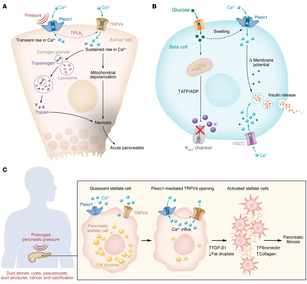(A) Piezo1-induced TRPV4 opening causes intracellular calcium ([Ca2+]i) elevation in acinar cells and is responsible for pressure-induced pancreatitis. Pressure or shear stress force opens Piezo1 channels, which induces phospholipase A2 (PLA2) and activates TRPV4. Sustained elevation in [Ca2+]i leads to mitochondrial depolarization, lysosome–zymogen granule fusion, trypsinogen activation, and pancreatitis. (B) Piezo1-induced [Ca2+]i elevation through glucose-triggered dynamic changes in volume and deformation in cell membrane facilitates insulin release from pancreatic β cells. (C) Pressure-sensing Piezo1 channel signaling activates PSCs. The activated phenotype lacks perinuclear fat droplets and shows increased levels of TGF-β1, fibronectin, and type I collagen that contribute to pancreatic fibrosis. VGCC, voltage-gated calcium channel.