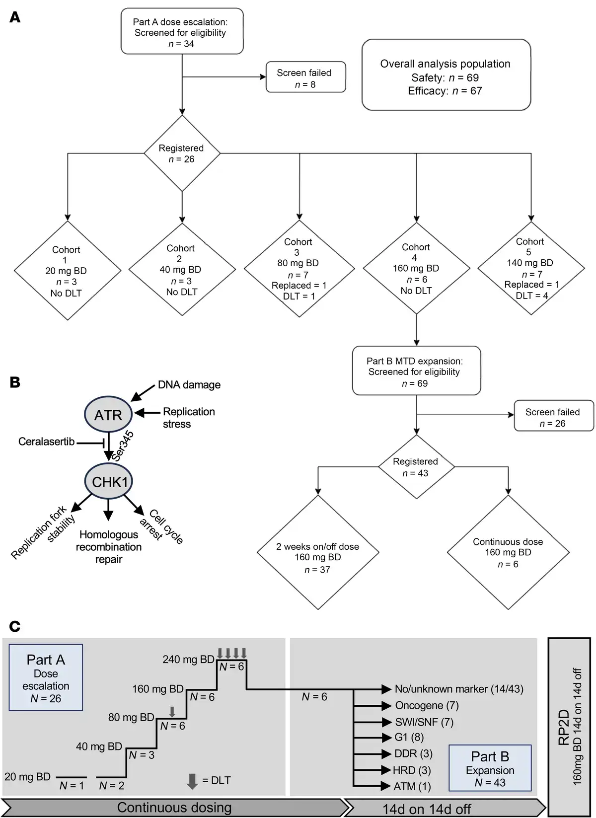 (A) CONSORT diagram of study parts A and B. (B) Schematic of role of ATR in DDR signaling. (C) Study schema for parts A and B. For part A, all patients received continuous dosing. For part B, they received continuous or intermittent dosing. Part B patients had mandatory tumor biopsy at baseline. All patients had PD sampling (PBMC, hair follicles) at baseline and at days 14–22. Response assessment was after 2 cycles of treatment.