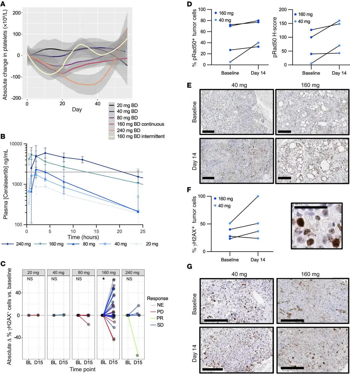 (A) Change in platelet count with time, by dose cohort. Smoothed conditional mean absolute changes compared with baseline blood count are presented, with 95% CI. (B) Ceralasertib PK. Geometric mean (and SD) plasma concentration over time after a single dose at the indicated dose levels (semi-log scale). (C) Absolute change in γH2AX-positive PBMCs (defined as percentage of cells with >5 foci) after 2-week dosing at the indicated dose levels. Line color indicates RECIST response. *P = 0.046, Wilcoxon’s signed rank test with a hypothetical median of 0. (D) Tumor PDs. Change in p-(S635)Rad50 in paired tumor biopsies after 2-week dosing. p-Rad50 in tumor cells expressed by percentage positive (left) and H score (right) for the indicated dose levels. Fold change versus baseline. P = 0.13, Wilcoxon’s signed rank test. (E) Examples of staining for p-Rad50 for the indicated dose levels. Scale bars: 200 μm. Left panel: HNSCC, 40 mg BD, RECIST PR. Right panel: parotid adenocarcinoma, 160 mg BD, RECIST SD. (F) Evidence of increased replication stress with ceralasertib treatment. Immunohistochemical staining for γH2AX in paired tumor biopsies. Left: change in percentage of positive tumor cells (defined as at least 5 nuclear foci or pan-nuclar staining) after 2-week dosing. P = 0.22, paired t test. Right: examples of nuclear foci and pan-nuclear staining after treatment. Scale bar: 50 μm. (G) Examples of γH2AX staining for the indicated dose levels. Left panel: HNSCC, 40 mg BD, RECIST PR. Right panel: serous ovarian carcinoma, 160 mg BD, RECIST SD. Scale bars: 200 μm.