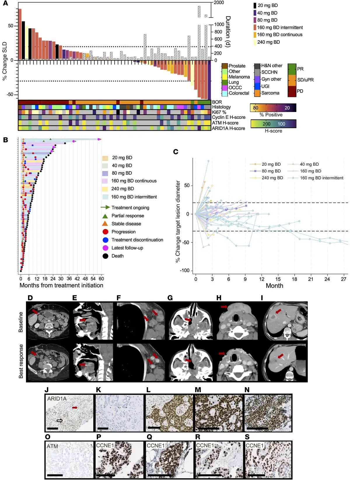 (A) Waterfall plot of best change in sum of longest diameters of target lesions (SLD), with corresponding duration on study. (B) Swimmer plot of evaluable patients. (C) Spider plot of evaluable patients. (D–I) Representative scans from responding patients. (D) Ovarian clear cell carcinoma, ARID1A loss, RECIST PR, 1,763 days on study, 160 mg BD, intermittent. (E) HNSCC, MRE11, and CDKN2A mutation, 1,194 days on study. (F) Esophageal squamous cell carcinoma, HR and Fanconi pathway deficiency, RECIST PR, 575 days on study, 160 mg BD intermittent. (G) Nasopharyngeal carcinoma, NRAS activation, RECIST PR, 341 days on study, 240 mg BD. (H) HNSCC, RECIST PR, 106 days on study, 40 mg BD. (I) Pancreatic adenocarcinoma, no clear mutation, unconfirmed PR, 480 days on study, 160 mg BD intermittent. Tumor protein profiling: IHC tumor staining was performed on the cases mentioned. Arrows indicate responding tumor lesions. (J) Clear cell ovarian carcinoma with loss of ARID1A, H score 0. Red arrowhead indicates tumor cells; white indicates stroma. (K) Eccrine adenocarcinoma with loss of ARID1A, H score 0. (L) Lung adenocarcinoma, ARID1A mutation but no protein loss. H score 290. (M) Cervix adenocarcinoma, ARID1A mutation but no protein loss. H score 300. (N) Clear cell ovarian carcinoma, ARID1A mutation but no protein loss. H score 235. (O) Serous ovarian carcinoma, ATM protein loss. (P) Same tumor as in M, showing cyclin E1 overexpression. H score 169. (Q) Peritoneal carcinoma, CCNE1 amplification on sequencing, cyclin E1. H score 210. (R) Serous endometrial carcinoma, CCNE1 amplification on sequencing, cyclin E1. H score 224. (S) Serous endometrial carcinoma, CCNE1 overexpression by IHC, cyclin E1. H score 155.