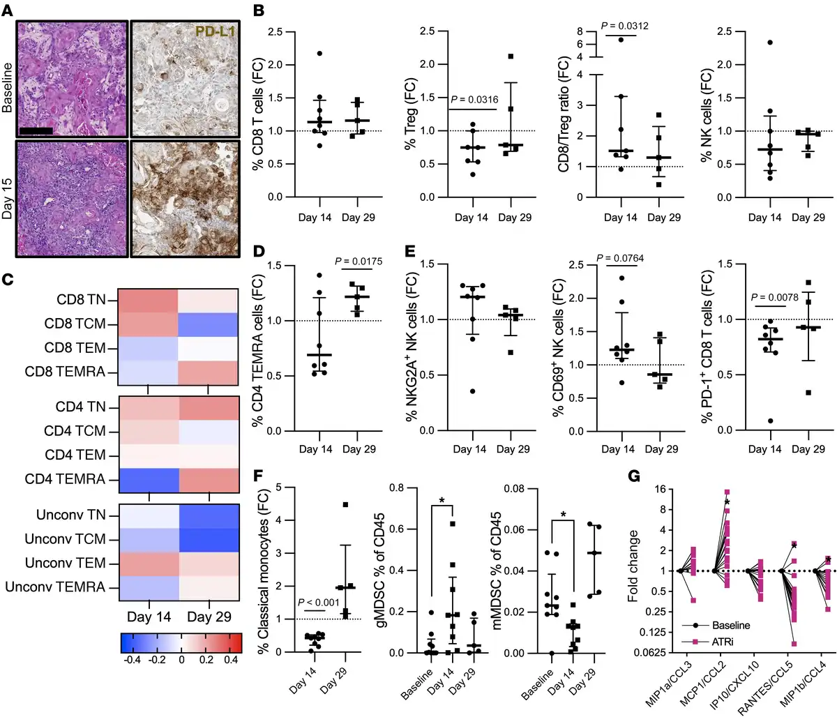 Therefore, we profiled, in detail, the immune response to ATRi in the peripheral blood of 8 participants (best responses of 5 SD, 2 progressive disease, and 1 nonevaluable [NE], all treated with 160 mg BD intermittent schedule) and in paired tumor biopsies (on treatment versus baseline) from 8 participants (5 SD, 2 progressive disease, and 1 NE). In the peripheral blood, we observed a reduction in Tregs and a trend toward increased CD8+ T cells, leading to an increased CD8/Treg ratio after ATRi (Figure 4B). All were on an intermittent schedule, allowing assessment of changes after 2 weeks of ceralasertib (day 14) and a 2-week break (day 29). Proportions of T cell subsets changed after ATRi, with increased naive and central memory CD8+ and CD4+ T cells after ATRi (Figure 4C). Importantly, there were increased frequencies of memory CD4-TEMRA (effector memory reexpressing CD45RA) cells at day 29 (Figure 4D). Detailed profiling revealed a reduction in PD-1–positive CD8+ T cells and NK cell activation, with a trend toward increased NKG2A- and CD69-positive NK cells with ceralasertib, which normalized after the 2-week break (Figure 4E). The circulating myeloid compartment was also altered by ATRi, with a reduction in classical and intermediate monocytes and a change in circulating myeloid-derived suppressor cells (MDSCs), with increased granulocytic MDSCs (gMDSC) and reduced monocytic MDSCs (mMDSCs) after ceralasertib, again trending to baseline after treatment break (Figure 4F). Circulating cytokine levels were modulated on ceralasertib therapy, with an increase in CCL2 and decrease in CCL4 and CCL5 levels observed after 2 weeks of treatment (Figure 4G).