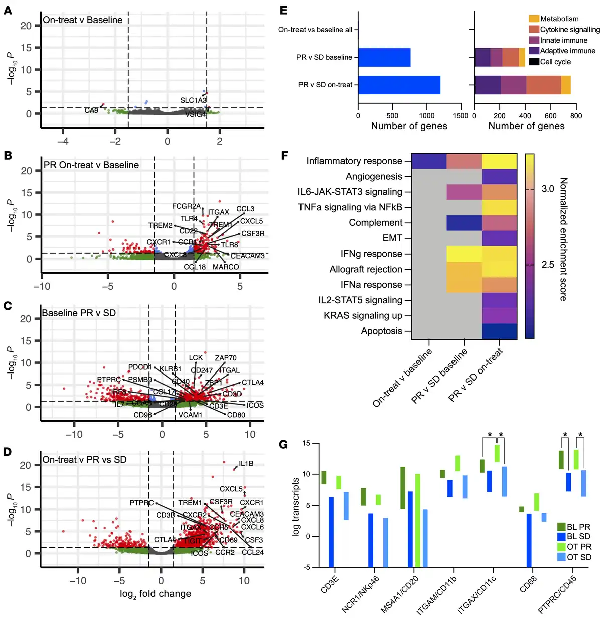 RNA-Seq of paired tumor biopsies was performed to assess differential gene expression after 2 weeks of ceralasertib treatment. Eight paired tumor biopsies were analyzed from 3 patients with PR, 4 with SD, and 1 NE, treated at various dose levels. Additional baseline samples were also available for 1 PR and 1 SD. When all samples were considered together, there were few differences in differential gene expression between baseline and on-treatment biopsies (Figure 5A). However, when responders (PR) were compared with nonresponders (SD), there were marked differences in both baseline and on-treatment gene expression (Figure 5, B–E) with clustering of a number of differentially expressed genes according to response (Supplemental Figure 8). The most common genes that were differentially expressed were immune related, with adaptive, innate, and cytokine-related genes highly represented (Figure 5E). Pathway analysis of the most differentially expressed genes found that these were predominantly immune related (Supplemental Figure 9). Gene-set enrichment analysis (GSEA) revealed enrichment of inflammatory response genes between baseline and on-treatment samples. When responders were compared with nonresponders, responding patients had more inflamed tumors both at baseline and on treatment, with significantly higher transcript levels for multiple immune-related genes (Figure 5F). Expression of cell-type–specific genes was different between responders and nonresponders. Responders had a significantly higher expression of PTPRC (CD45) at baseline and on treatment than nonresponders; they also had an increase in ITGAX (CD11c) with treatment. Several other genes showed similar elevation in responders compared with nonresponders, but this did not reach statistical significance (Figure 5G). When gene expression data were used for cell-type deconvolution, some differences were observed with treatment, particularly in neutrophil and macrophage populations (Supplemental Figure 10).