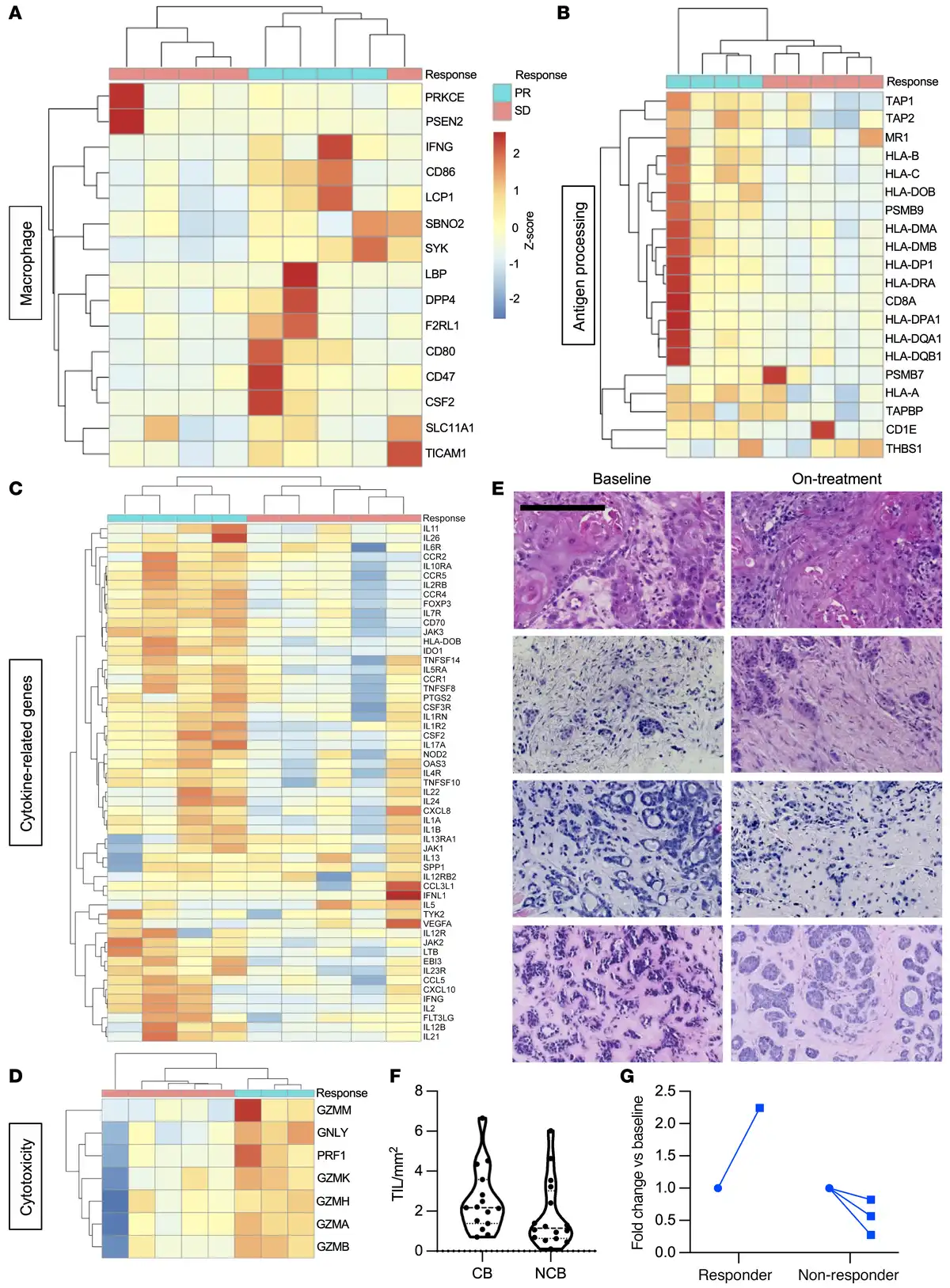 (A) Heatmap of macrophage-related gene expression in baseline tumor biopsies. (B) Heatmap of antigen processing–related transcripts in baseline biopsies. The first column represents the participant shown in Figure 2D, with high mutational burden. (C) Heatmap of cytokine-related gene expression in baseline tumor biopsies. Scale = z score, scaled by row. (D) Heatmap of cytotoxicity signature in on-treatment biopsies. (E) Representative images of tumor micrographs quantified in G. Top 3 rows: participants with SD. Lower row: participant with PR. Scale bar: 200 μm. (F) Stromal TIL count in H&E sections of patients who experienced clinical benefit (CB) (defined as PR or >16 weeks on study) compared with those who did not. (G) Fold change in stromal TILs in a responding patient and 2 nonresponding patients.