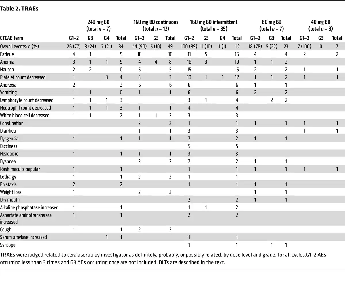 A total of 67 patients received a dose of ceralasertib and were evaluable for safety (Figure 1A). Twenty-six patients were treated with continuous dosing schedule during the dose-escalation phase, at doses from 20 to 240 mg BD (Figure 1C). At the maximum administered dose of 240 mg BD, 3 of 6 patients had dose-limiting toxicities (DLTs). There were no DLTs at 160 mg BD and 1 at 80 mg BD (grade 3 [G3] thrombocytopenia with epistaxis, Table 2 and Supplemental Table 2; supplemental material available online with this article; https://doi.org/10.1172/JCI175369DS1). The maximum tolerated dose was 160 mg BD. DLTs were thrombocytopenia (G4, n = 2 at 240 mg, G3 with epistaxis, n = 1 at 80 mg) and elevated amylase (G3, n = 1 at 240 mg, Supplemental Table 2). Dose-expansion participants received 160 mg BD, either continuously or on a 2-week-on, 2-week-off schedule (Figure 1C). This was investigated after the development of toxicity beyond the DLT window in continuously dosed patients, leading to dose modifications. The intermittent schedule was chosen based on modeling of bone marrow recovery and was better tolerated, with incidence of G3 or greater anemia, 33% on continuous versus 9% on intermittent schedule, and 8% versus 0 % G3 leukopenia. Platelets and other hematological parameters were also more favorable with an intermittent schedule, recovering in the treatment break (Figure 2A, Table 2, and Supplemental Figure 1) (). Six of 12 (50%) patients on the continuous schedule (including those in part A) versus 10 of 35 (29%) on the intermittent required dose reduction or interruption for toxicity. Four patients in the dose-escalation and 1 in the dose-expansion phase withdrew due to toxicity. There were no treatment-related deaths. Four deaths occurred on study medication: 2 from disease progression, 1 from pneumonia, and 1 from adult respiratory syndrome assumed to be COVID-19 related (no leukopenia observed for the latter 2 participants). The recommended phase 2 dose (RP2D) for the intermittent schedule was 160 mg BD, although other doses were not evaluated on an intermittent schedule. Serious adverse events related to study treatment are shown in Supplemental Table 1.