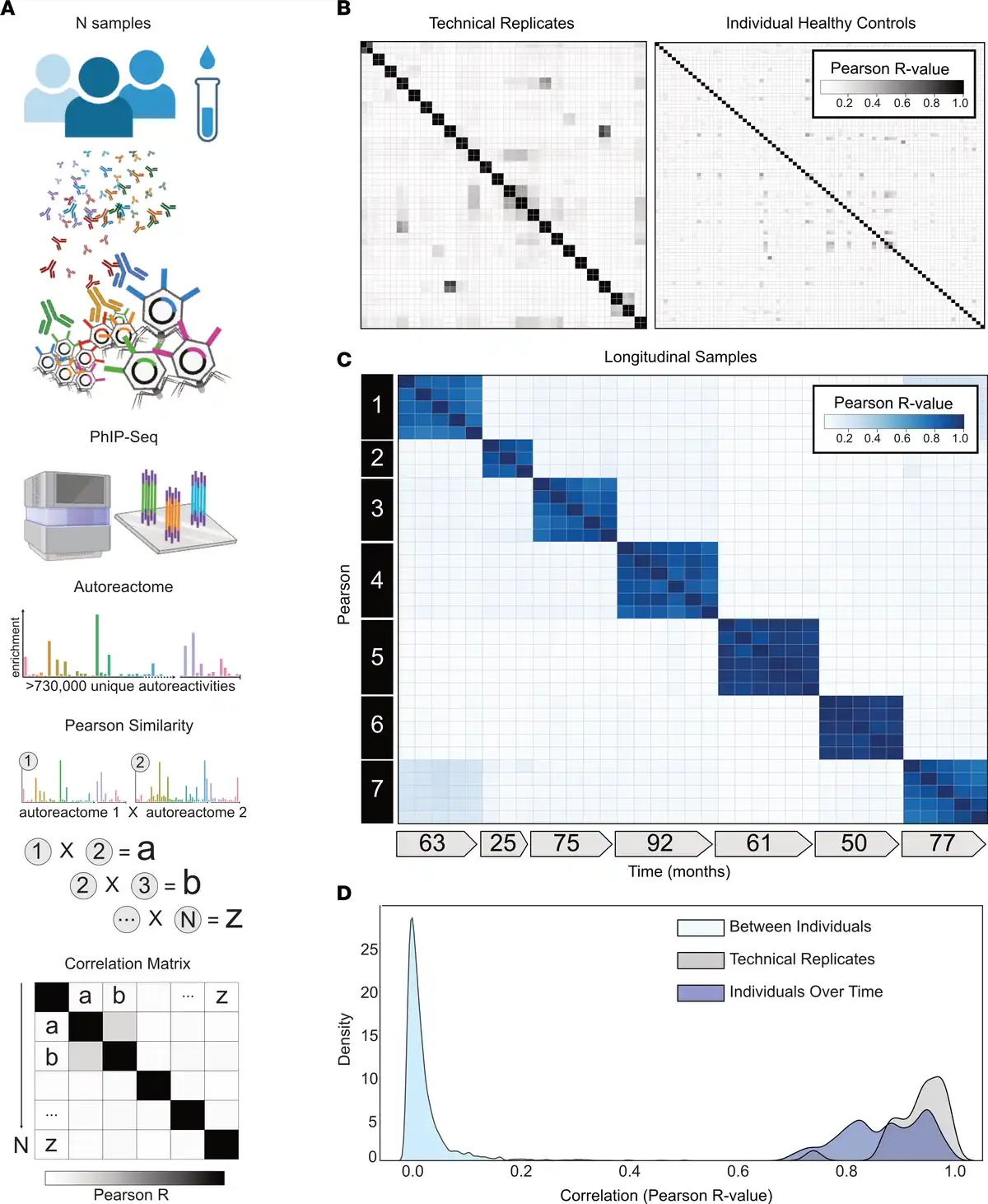 Figure 1. (A) Graphical representation of the analytical approach to quantitatively compare individual samples’ unique proteome-wide autoantibody signal (“Autoreactome,” containing up to 730,000 unique autoreactivities) to any other sample. (B) Correlation matrices showing Pearson’s correlation coefficients of complete PhIP-Seq signal in healthy individuals. Left: 48 samples representing 24 individuals in technical replicate (same data set as used in A). Right: 79 distinct individuals. (C) Correlation matrix showing Pearson’s r values for complete PhIP-Seq enrichment in 7 distinct individuals, each of whom have serial samples over at least 3 years. (D) Kernel density estimate plot showing distribution of Pearson’s r correlation coefficients among technical replicates, individuals over time, and between different individuals.