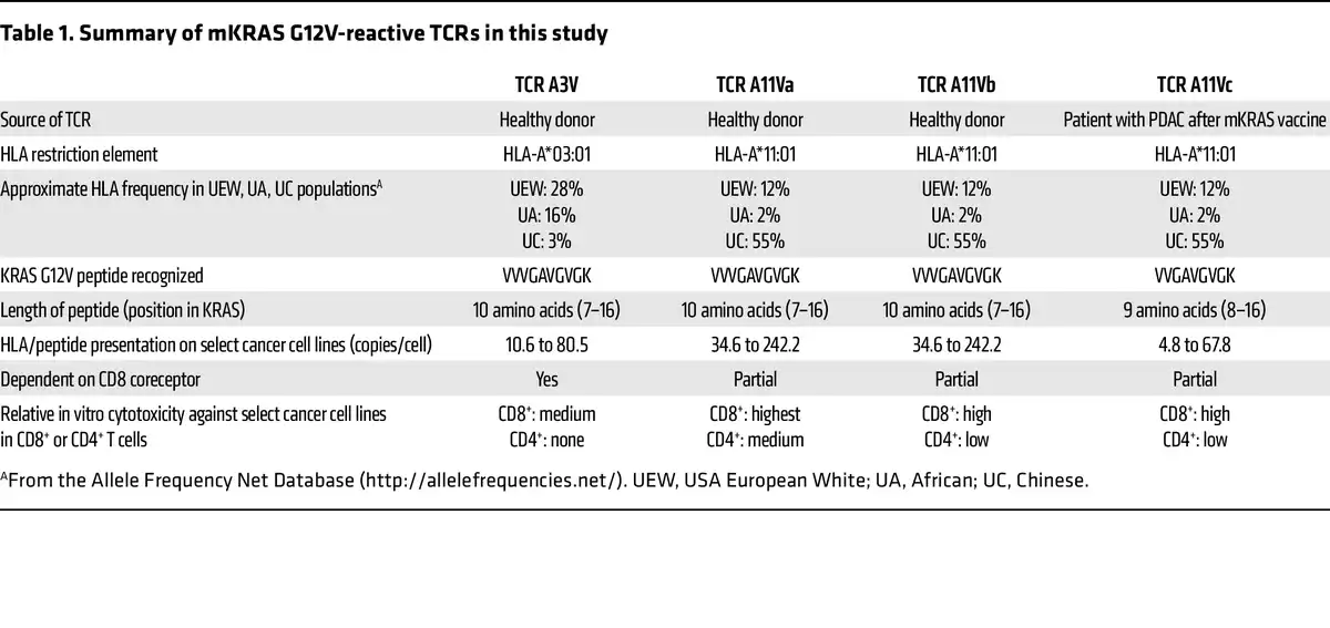 This TCR alongside three other KRAS G12V–reactive TCRs derived from peripheral blood T cells of two healthy donors underwent in vitro testing for specificity, cross-reactivity, functional avidity, function in CD4+ T cells (CD8 coreceptor dependency), and tumor cell-line recognition. Three of the four KRAS G12V-reactive TCRs were restricted by HLA-A*11:01 (A11Va, A11Vb, and A11Vc), while one TCR was restricted by HLA-A*03:01 (A3V). All four TCRs did not recognize wild-type KRAS, but interestingly, the three HLA-A*11:01–restricted TCRs recognized the KRAS G12C peptide, albeit at 10-to-100-fold lower potency compared with the KRAS G12V peptide. The authors did not identify any concerning cross-reactivity of the TCRs against a select panel of peptides derived from the human proteome that were structurally related to the G12V peptide.