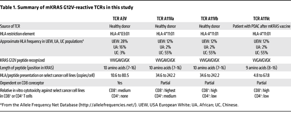 In an exemplary case, a patient with the HLA-A*03:01 and HLA-A*11:01 genotype was vaccinated with mature DCs pulsed with a nonamer (nine amino acid) and decamer (10 amino acid) KRAS G12V peptide. Two weeks later, the authors detected an elevated frequency of T cells in the peripheral blood that specifically recognized mKRAS G12V and not wild-type KRAS in the context of HLA-A*11:01. A mKRAS-reactive TCR sequence was isolated from an oligoclonal population of T cells in this patient (designated A11Vc).
