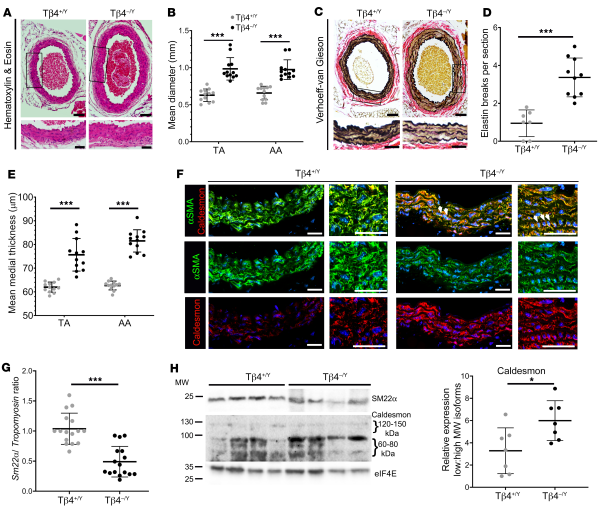 Although vascular defects cause lethality in a proportion of Tmsb4x/Tβ4 null embryos (36% of Tβ4–/Y males; 16% of Tβ4–/– females) (), most survive to adulthood. This prompted us to investigate whether vessel structure and function were entirely normal in viable adults. Due to the higher mortality in male embryos, we focused our studies on male mice. Compared with control Tβ4+/Y aortas, Tβ4–/Y aortas of 12- to 16-week-old mice were significantly dilated (mean 1.5-fold, determined histologically from both abdominal [AA] and thoracic [TA] sections; Figure 1, A and B). Moreover, aberrant elastin lamellar integrity suggested severely compromised vascular stability (3.6-fold more elastin breaks per section; Figure 1, C and D) and higher elastin damage score, according to a previously defined scoring system (), exemplified and quantified in Supplemental Figure 1, A and B; supplemental material available online with this article; https://doi.org/10.1172/JCI127884DS1). Tβ4–/Y aortas displayed medial thickening (Figure 1, A and E), and a 1.4-fold elevation of systemic vascular compliance was revealed by combined MRI and arterial blood pressure measurements (stroke volume/pulse pressure; Supplemental Figure 2A). Masson’s trichrome staining revealed limited aortic fibrosis (Supplemental Figure 2B). As platelets are a major source of factors, such as PDGF-BB, which promote medial layer defects, we excluded differences in the density of platelets (CD41) and activated platelets (P Selectin/PECAM-1) associating with the intimal layer (Supplemental Figure 3A) and confirmed comparable aortic Pdgfb expression between genotypes (Supplemental Figure 3B). Due to the requirement for Tβ4 in VSMC differentiation (, , ), we assessed the phenotype of medial layer VSMCs by measuring expression of established contractile (αSMA and SM22α) and so-called synthetic markers (Tropomysin and low-molecular-weight isoforms of Caldesmon) () by quantitative reverse transcription real-time PCR (qRT-PCR), immunofluorescence, and Western blotting (Figure 1, F–H; further quantification in Supplemental Figure 2, C and D; all full, uncut gels are published as online supplemental material). Significant reductions in the proportions of contractile/synthetic protein expression confirmed an overall shift toward more synthetic VSMCs in Tβ4–/Y aortas, which was consistent with the disorganized VSMC morphology observed (Figure 1F). While Tβ4+/Y aortas contained regularly aligned, elongated VSMCs, Tβ4–/Y aortas frequently contained clusters of small, densely packed cuboidal cells. Western blotting confirmed that the overall increase in Caldesmon levels (Figure 1F; quantified in Supplemental Figure 2C) results from a proportionally larger increase in the lower molecular weight isoforms associated with the synthetic phenotype (, ) (Figure 1H). Collectively, these data suggest that Tβ4–/Y VSMCs are less differentiated and more synthetic in phenotype than Tβ4+/Y VSMCs and that these defects may compromise vascular stability.