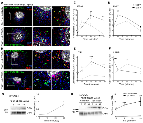 LRP1–PDGFR-β complexes, identified by PLA in primary aortic VSMCs, trafficking through endocytic compartments over a 60-minute time course (A–F). Shown at 30 minutes, colocalizing with early endosomes (EEA1; white arrows, A) and late endosomes (Rab7; yellow arrows, A) and with recycling endosomes (TfR; white arrows, B) and lysosomes (LAMP-1; yellow arrows, B). Quantification of colocalization in (C–F). By Western blotting, FLNa levels increase in MOVAS-1 in response to PDGF-BB treatment (G); FLNa levels are significantly elevated with reduced Tβ4 (Tβ4 siRNA vs Co siRNA; H). Data are mean ± SEM; n = 3 experiments, each from a separate VSMC isolation. Significance was calculated using 1-way ANOVA with Tukey’s post hoc tests. *P ≤ 0.05; **P ≤ 0.01; ***P ≤ 0.001. Scale bars: A: 5 μm (applies to all whole-cell views in A and B); boxed areas 1 and 2 shown magnified to left, with scale 2 μm (applies to all magnified views).