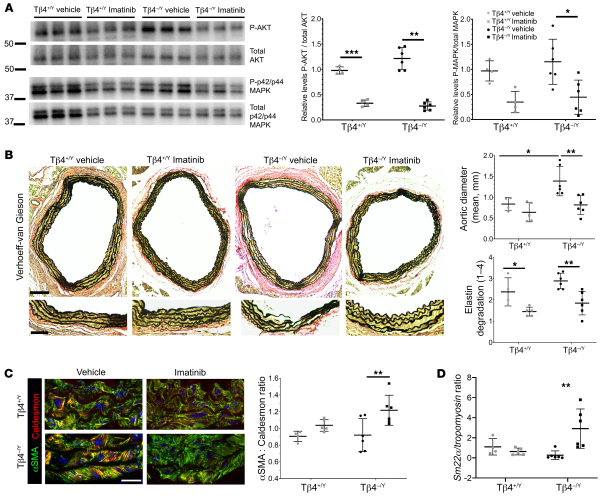 To evaluate the extent to which dysregulated LRP1–PDGFR-β signaling predisposes to AngII-induced aneurysm, we sought to rescue the exacerbated phenotype of Tβ4–/Y mice by pharmacological inhibition of the pathway. Imatinib (also known as Gleevec) is a tyrosine kinase inhibitor with relative specificity for PDGF receptors, as well as c-kit and Abl, which was shown to block autophosphorylation of PDGFR-β and tyrosine phosphorylation of the LRP1 ICD (), and to protect in mouse models of aneurysm (, ) and atherosclerosis (). Mice were gavaged with 10 mg/kg Imatinib or sterile water daily for 2 days prior to osmotic mini pump implantation (1 mg/kg/d AngII) and for 8 days after implantation until harvest. Imatinib significantly attenuated PDGFR-β signaling in both Tβ4+/Y and Tβ4–/Y aortas treated with AngII: P-PDGFR-β, P < 0.01; P-LRP1, P < 0.001; P-AKT, P < 0.001; P-ERK1/2, P < 0.01. Notably, levels of phosphorylated PDGFR-β and LRP1 (immunofluorescence, Supplemental Figure 13, A and B), as well as AKT and p42/p44 MAPK (Western blotting, Figure 11A) were comparable between Tβ4+/Y and Tβ4–/Y aortas after Imatinib treatment. Imatinib did not affect inflammation, assessed at the level of peripheral blood cytokine levels, which were unchanged by genotype or treatment (Supplemental Figure 14). We examined aortas histologically to determine whether restoration of signaling in Tβ4–/Y aortas was sufficient to preserve vascular integrity. Verhoeff-van Gieson staining revealed a striking degree of aortic protection, which was more pronounced in Tβ4–/Y than Tβ4+/Y mice (Figure 11B); aortic diameter was reduced 1.3-fold in Tβ4+/Y and 1.7-fold in Tβ4–/Y and elastin degradation was reduced by 1.6-fold in both Tβ4+/Y and Tβ4–/Y. VSMC phenotype was similarly preserved in Imatinib-treated Tβ4–/Y aortas, with increased expression of contractile markers Calponin 1 (Western blot, Supplemental Figure 13C), αSMA (immunofluorescence, Figure 11C), and Sm22a (qRT-PCR, Figure 11D) and a corresponding decrease in expression of synthetic markers, Caldesmon (immunofluorescence, Figure 11C) and Tropomyosin (qRT-PCR, Figure 11D). While a similar trend was apparent in Imatinib-treated Tβ4+/Y aortas, the magnitude of rescue was more modest and not statistically significant (Figure 11, C and D, and Supplemental Figure 13C).