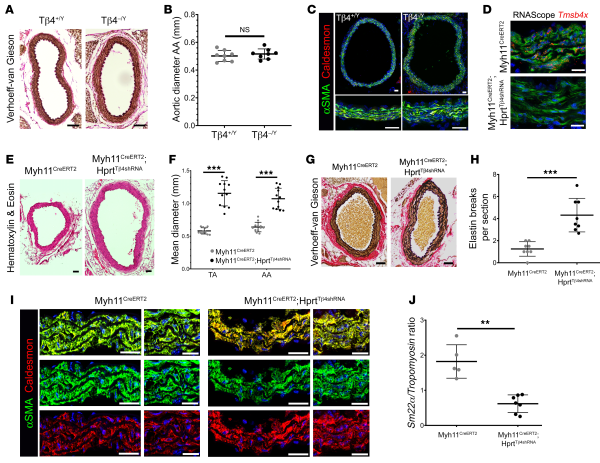 Verhoeff–van Gieson staining (A) to visualize elastin integrity, structure, diameter (B), and medial thickness (Supplemental Figure 4A) of aortas in P7 male mice. Immunofluorescence to assess smooth muscle phenotype (C). Tmsb4x was deleted from medial VSMCs of 3-week-old Myh11CreERT2 HprtTβ4shRNA knockdown mice; RNAScope for Tmsb4x mRNA, compared with Myh11CreERT2 Hprt+/+ control mice (D), quantified in Supplemental Figure 4B. Hematoxylin and eosin staining (E) assessed aortic dilatation and medial thickness in 12-week-old mice, quantified in F and Supplemental Figure 4C, respectively. Verhoeff–van Gieson staining (G) assessed elastin integrity, quantified both by number of breaks per section (H) and by elastin damage score (Supplemental Figure 1). Ratio of contractile/synthetic VSMC markers in Myh11CreERT2 HprtTβ4shRNA, compared with Myh11CreERT2 Hprt+/+ aortas, both at the protein (I; quantified in Supplemental Figure 4E) and mRNA level (qRT-PCR; J). Data are mean ± SD, with each data point representing an individual animal. Significance was calculated using a Mann-Whitney nonparametric test (B and J) or 2-tailed unpaired Student’s t tests (F and H with Holm-Sidak correction for multiple comparisons in F). **P ≤ 0.01; ***P ≤ 0.001. Scale bars: A, E, and G: 100 μm; C: 50 μm; D: 20 μm; I: 50 μm (low), 20 μm (high).