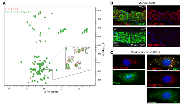 HMQC NMR spectra of 15N-labeled ICD of LRP1 and 3:1 Tβ4 (A). Proximity ligation assay demonstrated less than 40 nm proximity, suggesting an interaction of Tβ4 with LRP1 in murine aorta (B; representative image of n = 3). Immunofluorescence for LRP1 and Tβ4 revealed localization to punctate vesicular structures (C) in murine primary aortic VSMCs. PLA for Tβ4 and LRP1, with some signals localizing to early endosomes, labelled with EEA1 (C). Scale bars: B: 20 μm; C: 10 μm.
