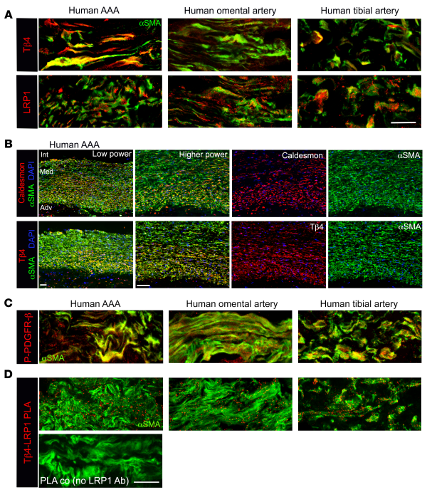 Conservation across species was confirmed by detection of Tβ4-LRP1 PLA signals in human VSMCs, both in aneurysmal aorta from AAA patients prospectively recruited to the Oxford Abdominal Aortic Aneurysm Study () and healthy vessels (omental artery biopsies from the same patients). Further comparisons were made with nonaneurysmal tibial arteries from patients with lower limb occlusive arterial disease (Figure 4). By immunofluorescence, Tβ4 levels were higher in AAA samples than in other arteries, while LRP1 levels were comparable (Figure 4A, quantified in Supplemental Figure 6). In the absence of a healthy aorta comparison, Tβ4 levels cannot be correlated with or causally implicated in disease, given the structural and functional differences between the aorta and smaller caliber arteries. However, examination of adjacent sections suggested that Tβ4 levels may be elevated in medial layer cells, which were more synthetic in phenotype, with Tβ4 levels appearing to correlate with Caldesmon but not αSMA levels across different regions of the same aorta (Figure 4B). Overall, Caldesmon and Tβ4 are expressed in a gradient, with higher levels in modulated VSMCs closer to the adventitia than intima and in outgrowths within the adventitia (Figure 4B), as occurs during aneurysmal aortic wall remodeling. In contrast, αSMA shows relatively uniform expression throughout the medial layer. These observations are consistent with our murine data that suggests that synthetic markers are upregulated prior to any substantial loss of contractile markers.