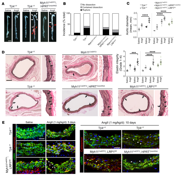 Our assessment of the Tβ4–/Y and Myh11CreERT2 HprtTβ4shRNA vasculature at baseline reveals defects that phenocopy those previously reported in smooth muscle–specific Lrp1–/– mice (, , ) (aortic dilatation, disrupted elastin layers, and poorly differentiated VSMCs; Figures 1 and 2 and comparison with Myh11CreLrp1fl/fl aortas in Supplemental Figure 7). These observations not only support a common pathway but also suggest that Tβ4-KO mice may, like LRP1 nulls, be similarly predisposed to develop aortic aneurysm. We tested this supposition, using the well-characterized murine model, in which aneurysm is induced by Angiotensin II infusion (AngII; 1 mg/kg/d) via a subcutaneously implanted osmotic mini pump. AngII at this dose is shown to minimally affect blood pressure in mice, but is thought to activate the angiotensin II type 1 (AT1) receptor on infiltrating leukocytes to promote their recruitment and adhesion (). Inflammatory macrophages and neutrophils secrete proteases that initiate degradation of the medial ECM (). VSMCs respond to injury by undergoing phenotypic modulation; synthetic VSMCs are more proliferative and migratory and also secrete elastolytic proteases to exacerbate the destruction of the elastin lamellae, leading to dilatation and frequently rupture or dissection (). Analysis of whole-mount aortas after 10 days of AngII infusion revealed an increased susceptibility of Tβ4–/Y mice to aneurysm, compared with Tβ4+/Y controls (Figure 5A). Phenotypes ranged from more pronounced ascending and descending aortic aneurysm (defined as > 1.5-fold dilatation; mild) to abdominal aortic rupture, hematoma formation, and death in less than 5 days (severe) (quantified in Figure 5B; examples of ruptures shown in Supplemental Figure 8 were excluded from d10 analysis in Figure 5). Although rare (< 10%), dissections were detectable in Tβ4–/Y as blood tracking into the adventitial matrix or between medial and adventitial layers (Supplemental Figure 8). Given the prominent role of inflammation in driving aneurysm progression with AngII treatment and the numerous antiinflammatory roles ascribed to Tβ4 (, , ), we also investigated aneurysm susceptibility in tamoxifen-dosed Myh11CreERT2 HprtTβ4shRNA knockdown mice, alongside Myh11CreERT2 Hprt+/+ controls (Figure 5A) and Myh11CreERT2Lrp1fl/fl mice, in order to avoid disrupting Tβ4-LRP1 function in immune cells. Similar to global Tβ4 knockouts, VSMC-specific Tβ4 knockdown mice displayed an increased incidence of rupture, as well as aortic aneurysms and a higher mortality rate over the 10-day time course (Figure 5, A–C and representative ruptures shown histologically in Supplemental Figure 8). Mean aortic diameter, measured on histological sections, was increased by 1.6-fold in Tβ4–/Y mice and 1.8-fold in Myh11CreERT2 HprtTβ4shRNA mice, compared with their respective AngII-treated controls. This compares with a 1.5-fold increased diameter in Myh11CreLrp1fl/fl aortas (Figure 5C). Elastin integrity was severely breached in Tβ4–/Y, Myh11CreERT2 HprtTβ4shRNA and Myh11CreLrp1fl/fl aortas, with more breaks per section and higher mean integrity scores than in Tβ4+/Y and MyhCreERT2 Hprt+/+ controls (2.95, 2.85, and 2.82 versus 2.11 and 1.76, respectively; Figure 5D). By these parameters, elastin degeneration in Tβ4–/Y and Myh11CreERT2 HprtTβ4shRNA aortas was comparable with that in Myh11CreLrp1fl/fl aortas (Figure 5D). Accentuated VSMC dedifferentiation was also evident in Tβ4–/Y and Myh11CreERT2Lrp1fl/fl aortas, compared with respective controls (Tβ4+/Y only shown, Figure 5E). At 5 days, the prominent morphological alterations were accompanied by increased expression of synthetic markers Caldesmon (Figure 5E and Supplemental Figure 9A ) and Vimentin (Supplemental Figure 9B) and a reciprocal loss of contractile markers αSMA (Figure 5E) and Calponin (Supplemental Figure 9A). Consistent with this, proliferation levels increased in some Tβ4–/Y aortas compared with controls (Ccnd1 qRT-PCR; Supplemental Figure 9C). After 10 days of AngII infusion, a further shift in phenotype was observed, along with a greater VSMC loss, in Tβ4–/Y, Myh11CreERT2 HprtTβ4shRNA, and Myh11CreLrp1fl/fl aortas compared with controls (Figure 5E). VSMC degeneration is rapid in the AngII infusion model and detection of TUNEL+ apoptotic cells within the medial layer was rare; most aortas lacked TUNEL+ VSMCs and, in fact, intimal endothelial cells and adventitial cells were more frequently TUNEL+ than VSMCs (Supplemental Figure 9D). Although there appear to be more TUNEL+ VSMCs in Tβ4-null aortas, quantification of apoptosis in this model is confounded since severely affected medial regions, which include large numbers of necrotic cells devoid of VSMC markers, typically contain fewer TUNEL+ nuclei than regions with less advanced disease, as exemplified in the comparison of Tβ4–/Y at d5 versus d10 (Supplemental Figure 9D). Thus, we cautiously avoid overstating conclusions around the extent of apoptosis in aneurysmal Tβ4-null aortas.