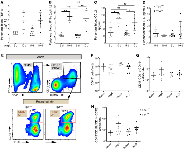 Beyond using a VSMC-specific targeting strategy, we sought to further exclude a causative difference in inflammatory responses between genotypes by determining expression of proinflammatory cytokines in peripheral blood by multiplexed automated ELISA. While the levels of tumor necrosis factor α (TNF-α), interferon γ (IFN-γ), and C-C motif chemokine 2 (CCL2) increased markedly over the course of AngII infusion, there were no significant differences between genotypes at any time point. IL-6 levels were unchanged between d5 and d10 of AngII treatment and also unaffected by loss of Tβ4 (Figure 6, A–D). This was borne out in the quantification of immune cells recruited to the aorta (Figure 6, E–H). Aortic leukocytes (CD45+) and monocytes (CD45+CD11b+CD14+) were assessed by flow cytometry. Recruited monocytes were further defined based on expression of the chemokine receptor CCR2, implicated in recruitment of monocyte-derived macrophages to the aorta and development of AAA (). Although the numbers of macrophages (CD45+CD11b+CD14+CCR2+) increased with 5 days of AngII treatment, compared with saline, there were no differences between Tβ4+/Y and Tβ4–/Y. Collectively, these data demonstrate that loss of Tβ4 predisposes to aortic aneurysm, phenocopying VSMC-specific LRP1 mutants. Exacerbated disease progression in Tβ4 mutants does not relate to aggravated inflammation, rather to the more advanced VSMC phenotypic modulation and degeneration of the elastin lamellae.