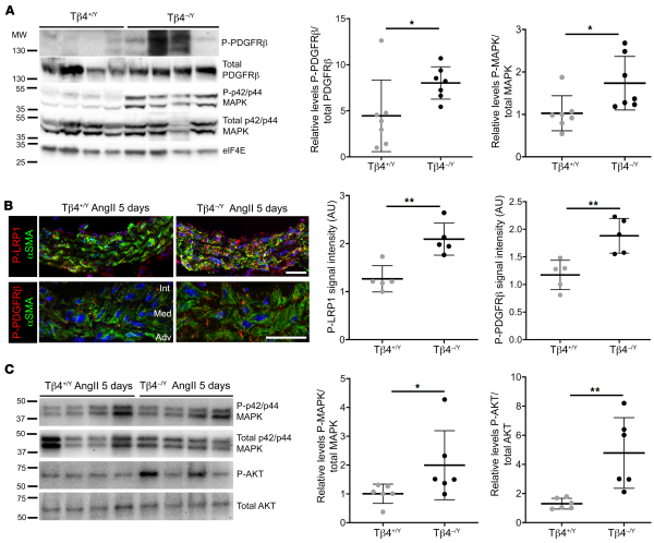 Baseline PDGFR-β pathway activity in Tβ4+/Y and Tβ4–/Y aortas from adult mice, determined by Western blotting for phosphorylated PDGFR-β and p42/p44 MAPK, relative to total levels (A; representative of n = 7). Phospho-LRP1 (Tyr 4507) and Phospho-PDGFR-β (Tyr1021) levels in AAA VSMCs after 5 days of AngII infusion (B) and Western blotting of downstream effectors, phosphorylated p42/p44 MAPK and AKT, expressed relative to total p42/p44 MAPK and AKT, respectively (C; representative of n = 6). Data are mean ± SD, with each data point representing an individual animal. Significance was calculated using a Mann-Whitney nonparametric test. *P ≤ 0.05; **P ≤ 0.01. int: intima; med: media; adv: adventitia. Scale bars: B: 50 μm.