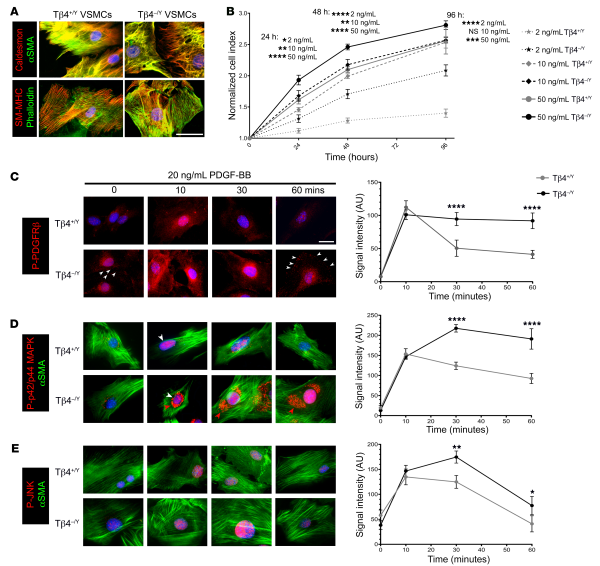 Isolated VSMCs from Tβ4+/Y and Tβ4–/Y aortas (A). Proliferation curves of VSMCs treated with 2, 10, and 50 ng/mL PDGF-BB (B). Time course of PDGF-BB treatment and quantitative immunofluorescence of phosphorylated PDGFR-β (C), p42/p44 MAPK (D), and JNK (E). In C, white arrowheads highlight cell surface staining; in D, white arrowheads show nuclear staining, red arrowheads indicate perinuclear (Golgi) staining. Data are mean ± SEM, n = 3 experiments, each from a separate VSMC isolation. Significance was calculated using 1-way ANOVA with Tukey’s post hoc tests. *P ≤ 0.05; **P ≤ 0.01; ***P ≤ 0.001; ****P ≤ 0.0001. Scale bars: 50 μm (scale bar in C applies to D and E).