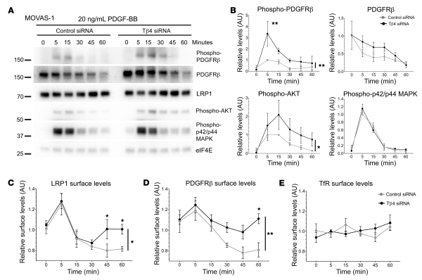 Endocytosis of PDGFR-β and its coreceptor LRP1 is required not only to transduce signals to downstream effectors but also to terminate pathway activity (, ). From endosomes, the LRP1–PDGFR-β complex may be recycled to the cell membrane or targeted for lysosomal degradation. Regulation of receptor trafficking critically determines sensitivity to PDGF ligands and magnitude of cellular responses. We, therefore, sought to investigate a role for Tβ4 in endocytosis of the LRP1–PDGFR-β complex, to determine if this may, at least in part, explain the effects of Tβ4 on PDGF-BB signaling. Initial studies were performed in MOVAS-1 murine aortic cells, with siRNA-mediated knockdown of Tβ4 (reduced to 10.1% ± 7.9% at the mRNA level; Supplemental Figure 12). Western blotting confirmed an enhanced and more sustained activation of components of the PDGFR-β pathway in serum-starved, Tβ4 siRNA-treated MOVAS-1, upon addition of 20 ng/mL PDGF-BB (Figure 9A). Y1021-phosphorylated PDGFR-β and S473-phosphorylated AKT were significantly enhanced, although phosphorylated p42/p44 was unaffected in Tβ4 knockdown MOVAS-1 (Figure 9B). Total PDGFR-β levels declined steadily over the 60 minutes, consistent with lysosomal targeting and degradation and decline was notably slower in Tβ4 knockdown cells (Figure 9B). In parallel, we performed surface biotinylation assays to measure levels of LRP1 and PDGFR-β at the cell membrane over the same 60-minute time course of PDGF-BB treatment. Surface levels of LRP1 peaked after 5 minutes of treatment, with a comparable fold-change and rate of decline in knockdown and control cells up to 30 minutes (Figure 9C), suggesting that Tβ4 is not required for translocation of receptors to the membrane or the initial steps of receptor-mediated endocytosis. However, whereas LRP1 levels in control cells declined further and remained significantly below baseline through to 60 minutes, consistent with the expected degradation (), LRP1 levels in Tβ4 siRNA-treated cells recovered almost to baseline by 45 minutes (Figure 9C). Similar profiles were observed for PDGFR-β, except that the rate of decline in surface levels was more gradual in Tβ4 siRNA-treated cells, compared with controls. Levels fell between 5 and 45 minutes of treatment. Thereafter, a steep recovery of surface levels was observed in knockdown but not in control cells (Figure 9D). In contrast, surface levels of the transferrin receptor (TfR), which constitutively internalizes and rapidly recycles the iron carrier protein in a ligand-independent manner via receptor-mediated endocytosis (), were not affected by loss of Tβ4, thereby ruling out a generalized endocytosis defect (Figure 9E). Collectively, these data suggest that in the absence of Tβ4, LRP1–PDGFR-β complexes are preferentially recycled to the cell surface and proportionally fewer receptors are targeted for lysosomal degradation, leading to enhanced and sustained pathway activation.