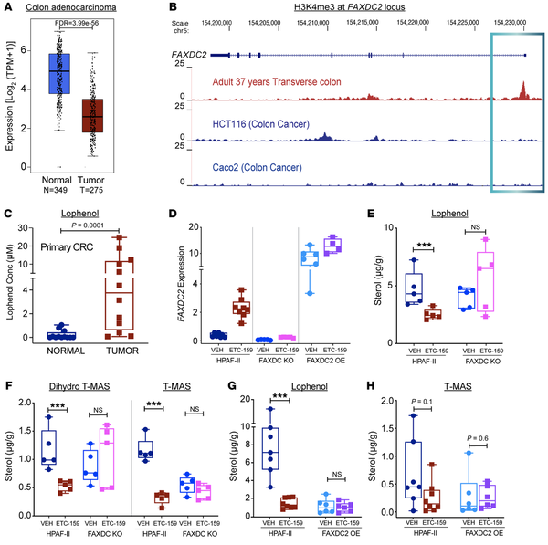 Figure 3. (A–C) Primary Wnt-high colorectal cancers have repressed FAXDC2 expression and high levels of lophenol. (A) FAXDC2 is repressed in primary colorectal cancers compared with corresponding normal tissues. Expression of FAXDC2 was compared in normal tissues versus tumor tissues using GEPIA 2.0 (TCGA and GTEx data sets). (B) H3K4me3, a marker of active transcription, marks the FAXDC2 genomic locus in the normal colon but is absent in cancer cell lines. Data from Cistrome Data Browser. (C) Lophenol is markedly elevated in primary colorectal cancers. Sterol abundance was measured in primary colorectal cancers and adjacent normal tissue by GC-MS. Each point represents lophenol levels in an individual tumor, n = 12 tumors per group. (D–H) Manipulation of FAXDC2 expression regulates C4-methyl sterol abundance. (D) Relative expression of FAXDC2 in HPAF-II, FAXDC2-KO, and FAXDC2-OE xenografts as measured by qRT-PCR. (E and F) Knockout of FAXDC2 abrogates the ETC-159 treatment–induced change in the abundance of C4-methyl sterols. Sterol abundance was measured in HPAF-II and FAXDC2-KO xenografts from control and ETC-159–treated mice. Each point represents the level of indicated methyl sterols measured using GC-MS in an individual tumor sample, n = 4–5 per group. (G and H) FAXDC2 overexpression reduces lophenol and T-MAS to levels comparable to those in the Wnt-inhibited tumors. Sterol abundance was measured in HPAF-II and FAXDC2-OE xenografts from control and ETC-159–treated mice. Each point represents the abundance of methyl sterols measured using GC-MS in an individual tumor sample, n = 4–5 per group. P values were calculated by Mann-Whitney U test for all graphs in this figure. ***P ≤ 0.001.