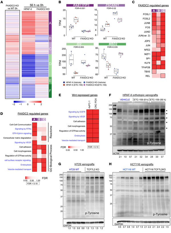 (A) Expression of a subset of Wnt-regulated genes depends on FAXDC2 (FDR < 10%). Heatmap of fold changes of 3,560 FAXDC2-dependent Wnt-regulated genes (interaction test, FDR < 10%). Left: Gene expression changes (log2 fold changes) between WT and FAXDC2-KO tumors at 0 hours. Right: Gene expression changes following treatment with ETC-159 in both parental HPAF-II tumors (56 vs. 0 hours) and FAXDC2-KO tumors (56 vs. 0 hours). This set of differentially responding genes was partitioned into 6 distinct clusters based on similarities in their response to ETC-159, including 3 clusters of Wnt-repressed genes (A, B, and C) and 3 three clusters of Wnt-activated genes (D, E, and F). (B) Representative genes from 4 clusters in part A show that FAXDC2 knockout blunts or reverses the response to Wnt inhibition (hypergeometric test, FDR < 10%). TPM, transcripts per million. (C) FAXDC2-regulated Wnt-repressed genes in clusters A–C show an enrichment of AP1 family TFBS motifs in their promoters (hypergeometric test, FDR < 10%). (D) RTK signaling pathways are enriched in FAXDC2-regulated Wnt-repressed genes. Data from representative GO Biological Process and Reactome enrichment of Wnt-repressed genes from clusters A–C that were identified in part A (hypergeometric test, FDR < 10%). (E) GO Biological Processes and Reactome enrichment analysis of Wnt-repressed genes in ETC-159–treated AsPC-1 and colorectal cancer PDX tumors shows an upregulation of RTK signaling pathways (hypergeometric test, FDR < 10%). (F) Pharmacologic Wnt inhibition with ETC-159 in HPAF-II xenografts increases protein tyrosine phosphorylation. HPAF-II orthotopic tumor protein lysates from vehicle- or ETC-159–treated mice were separated on a 10% SDS gel. Blots were probed with phosphotyrosine antibodies. Each lane represents tumor lysate from an individual mouse. Asterisks indicate prominent phospho-tyrosine bands. (G and H) Genetic inhibition of Wnt/β-catenin signaling in TCF7L2-KO HT29 and HCT116 xenografts increases protein tyrosine phosphorylation. Protein lysates from WT and TCF7L2-KO HT29 and HCT116 tumors were analyzed for abundance of phosphotyrosine proteins as in F. Each lane contains tumor lysate from an individual mouse.
