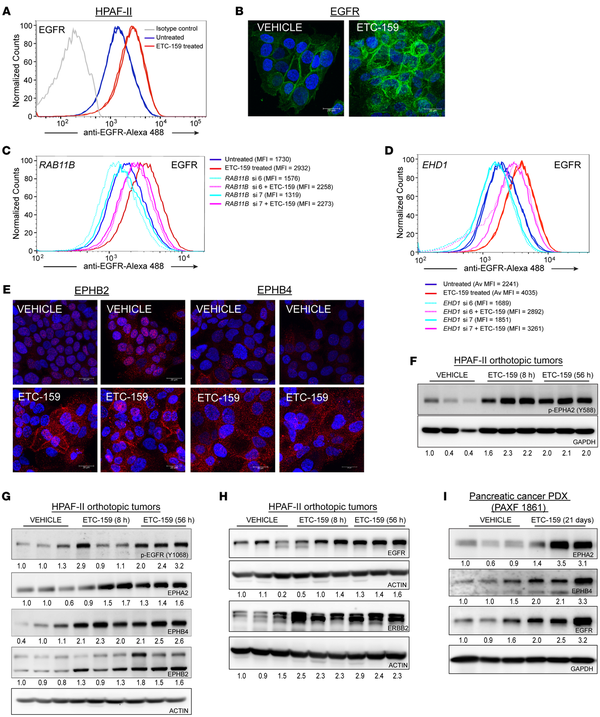 (A and B) ETC-159 treatment of HPAF-II cells increases abundance of EGFR on the cell surface. HPAF-II cells were treated with 100 nM ETC-159 for 72 hours. (A) Cells were stained with Alexa Fluor 488–conjugated anti-EGFR antibody and analyzed by flow cytometry. Each histogram represents ~50,000 cells. Data are representative of 3 independent experiments (P = 0.009). (B) Endogenous EGFR levels on non-permeabilized cells were assessed by indirect immunofluorescence microscopy. Scale bars: 20 μm. (C and D) Partial knockdown of RAB11B or EHD1 blunts the ETC-159–induced EGFR increase on the surface of HPAF-II cells. HPAF-II cells were transfected with 2 independent siRNAs (si6 and si7) against RAB11B (C) or EHD1 (D) for 24 hours, followed by treatment with ETC-159 for 72 hours. EGFR levels on the cell surface were assessed by flow cytometry. Each histogram represents ~50,000 cells from 1 replicate. Data are representative of 3 independent experiments. Average median fluorescence intensity (MFI) of the technical replicates is shown. Av MFI, average MFI of the technical replicates from the same experiment. (E) EPHB2 and EPHB4 levels are increased by Wnt inhibition. HPAF-II cells were treated with 100 nM ETC-159 for 72 hours, and the levels of endogenous EPHB2 and EPHB4 on non-permeabilized cells were assessed by indirect immunofluorescence microscopy. Scale bars: 20 μm. (F–I) Wnt inhibition increases activation of EPHA2 and EGFR receptor tyrosine kinases and protein abundance of multiple receptor tyrosine kinases in HPAF-II xenografts and pancreatic PDX models. Protein lysates from HPAF-II orthotopic xenografts or pancreatic PDX from vehicle- or ETC-159–treated mice were analyzed for expression of p-EPHA2 and p-EGFR and abundance of indicated RTKs by Western blots. Each lane represents tumor lysate from an individual mouse. (H) The protein lysates were prepared as a master mix and loaded on independent gels. Only 1 blot was probed for the load control, which is shared with Figure 4F.