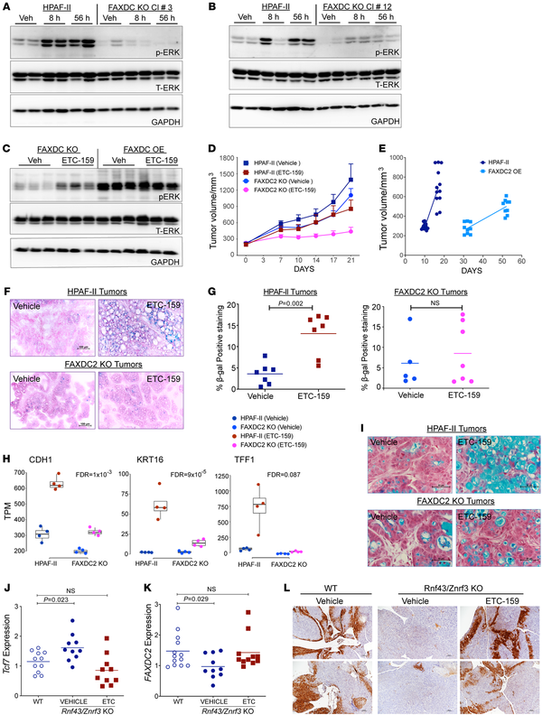 Figure 7. (A and B) FAXDC2 is required for MAPK activation. Xenografts from 2 independent FAXDC2-KO clones had reduced ERK phosphorylation with no further increase upon ETC-159 treatment. Protein lysates were prepared as a master mix and loaded on independent gels. Load control of A is shared with Figure 6D and of B with Figure 6H. (C) FAXDC2 overexpression mediates sustained ERK activation. Western blot analysis of protein lysates from indicated xenografts. Each lane represents tumor lysate from an individual mouse. (D) Knockout of FAXDC2 reduced the growth of HPAF-II subcutaneous xenografts, with further reduction upon Wnt inhibition. n = 5–6 mice per group. (E) Overexpression of FAXDC2 delayed implantation and reduced growth of HPAF-II xenografts. n = 5–6 mice per group. (F and G) Wnt inhibition caused an increase in senescence-associated β-galactosidase in HPAF-II tumors that was diminished in the FAXDC2-KO tumors. (F) Representative images are shown. Scale bars: 100 μm. (G) Percentage of positively stained area (blue) was quantitated. Each dot represents quantitation of a tumor section from an individual mouse. P values were calculated by Mann-Whitney U test. (H and I) FAXDC2 knockout blunts the differentiation response to Wnt inhibition. (H) Expression of selected differentiation markers in tumors assessed by RNA-Seq. Each data point represents an individual tumor (hypergeometric test, FDR <10%). (I) FAXDC2 knockout blunts the Wnt inhibition–mediated increase in mucin expression as assessed by Alcian blue staining. Scale bars: 50 μm. (J–L) The Wnt/MAPK axis is present in non-malignant mouse pancreas. (J and K) Genetic activation and subsequent pharmacologic inhibition of Wnt signaling in mouse pancreas led to reciprocal regulation of Faxdc2 expression. Pancreas from control or ETC-159–treated WT and Ptf1αCre Rnf43–/– Znrf3–/– mice was analyzed for (J) Tcf7 and (K) Faxdc2 (Gm12248) expression by qRT-PCR. Data are from 2 independent biological experiments; each dot represents an individual mouse. P values were calculated by the Mann-Whitney U test. (L) Wnt activation reduced p-ERK levels in the mouse pancreas as assessed by IHC. Representative image of anti–p-ERK–stained pancreas. Scale bars: 100 μm.