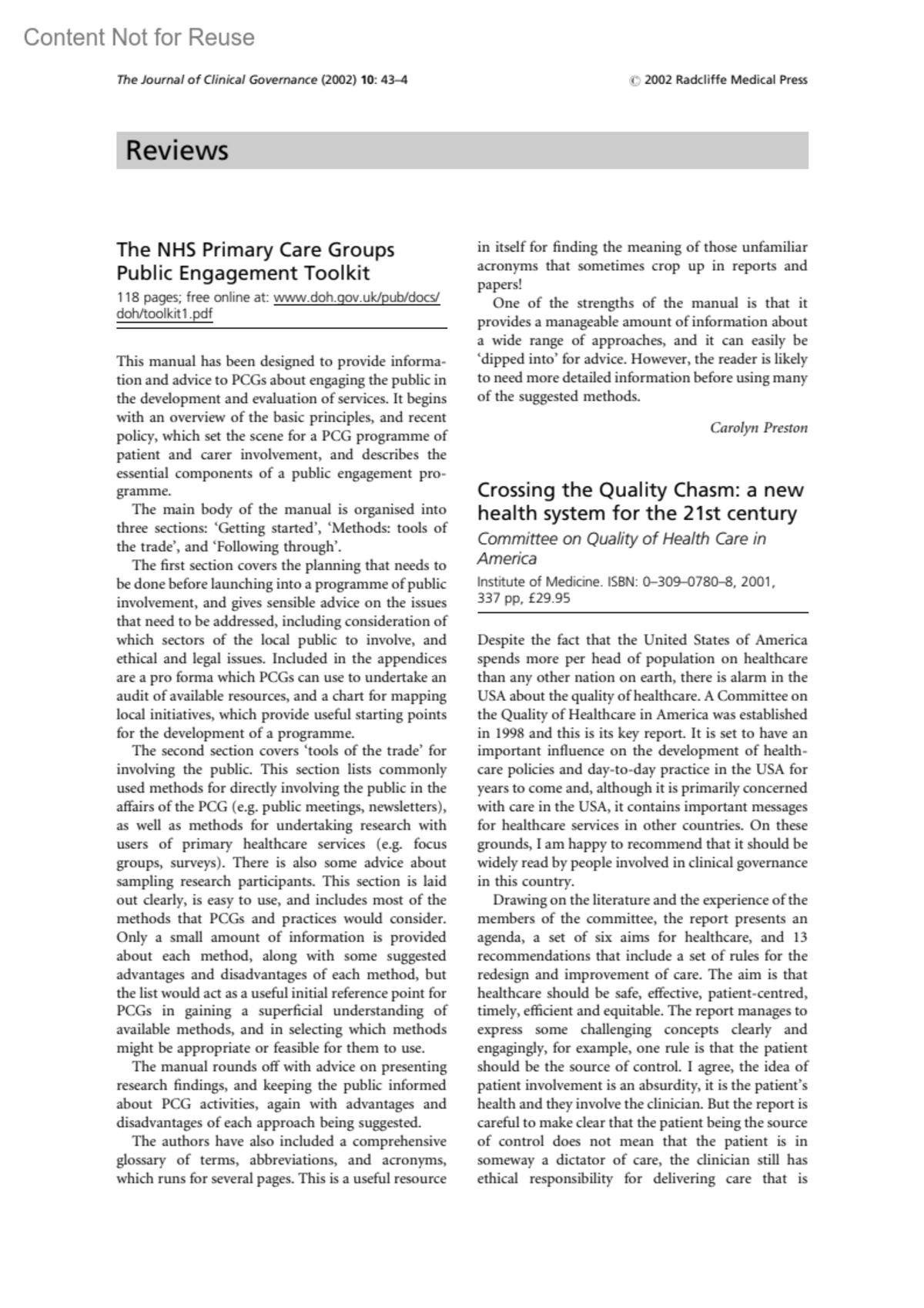 The NHS Primary Care Groups Public Engagement ToolkitPreston, CarolynThe Journal of Clinical Governance 10(1):p 43, 2002.Copyright ©2002 Radcliffe Medical Press Ltd.