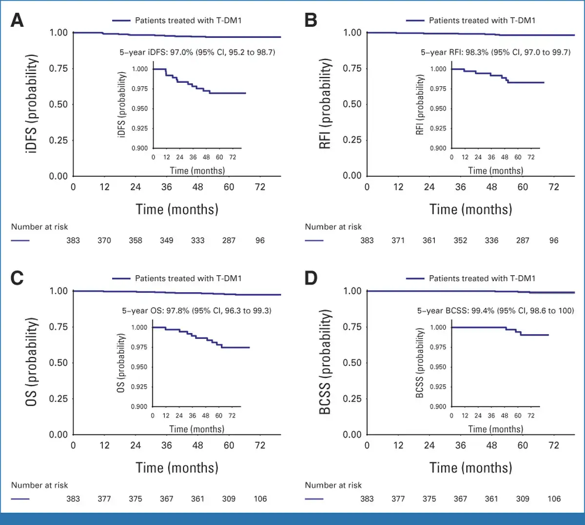 Survival outcomes in the T-DM1 arm in terms of (A) iDFS, (B) RFI, (C) OS, and (D) BCSS. Outstanding long-term outcomes were observed among patients with stage I HER2-positive breast cancer receiving adjuvant T-DM1, with a 5-year iDFS of 97.0%, and only three distant recurrences were observed among 383 patients treated in the study arm. BCSS, breast cancer–specific survival; HER2, human epidermal growth factor receptor 2; iDFS, invasive disease-free survival; RFI, recurrence-free interval; T-DM1, trastuzumab emtansine.