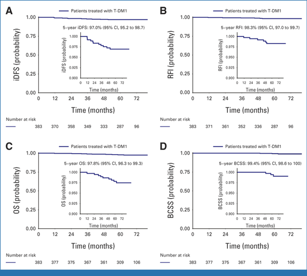 After a median follow-up of 5.8 years, 11 iDFS events were observed in the T-DM1 arm, consistent with a 5-year iDFS of 97.0% (95% CI, 95.2 to 98.7; Fig 2A). The 5-year RFI was 98.3% (Fig 2B, 95% CI, 97.0 to 99.7), the 5-year overall survival (OS) was 97.8% (Fig 2C, 95% CI, 96.3 to 99.3), and the 5-year breast cancer-specific survival (BCSS) was 99.4% (Fig 2D, 95% CI, 98.6 to 100). Among the 11 iDFS events observed with T-DM1, only three were distant recurrences, with the remaining events being two ipsilateral recurrences (one of which was HER2-negative), three new contralateral primary breast cancers (all HER2-negative), and three non–breast cancer-related deaths (Data Supplement, Table S1).
